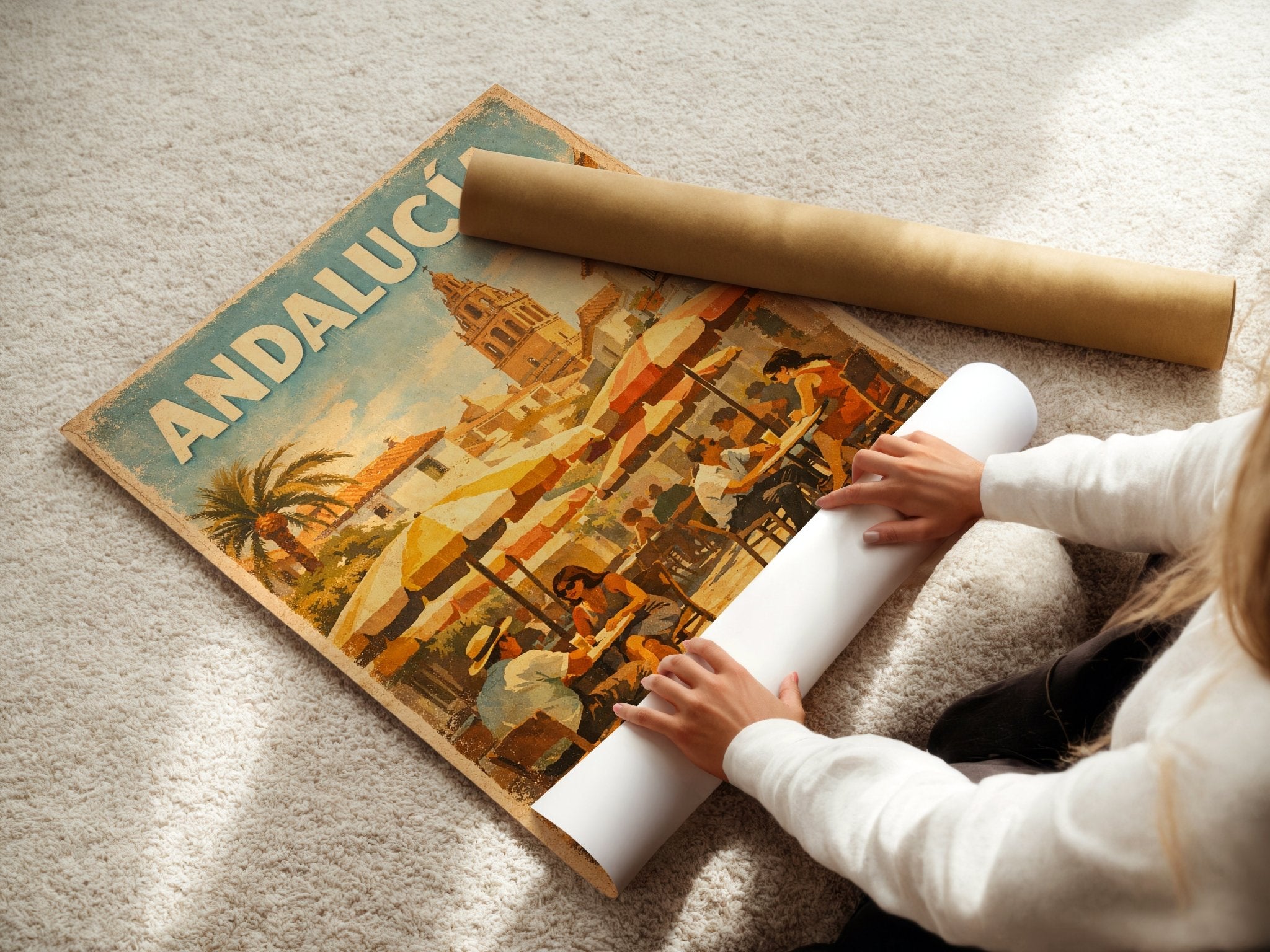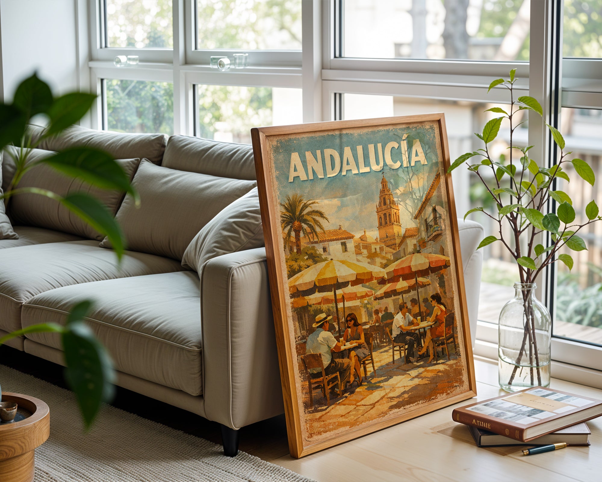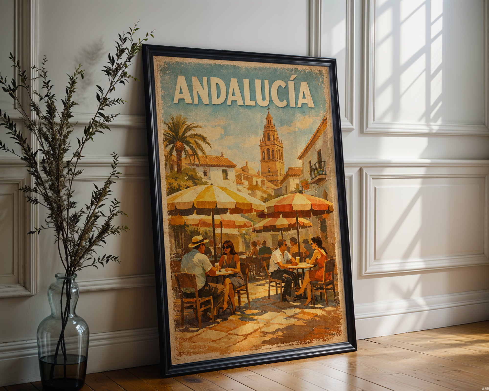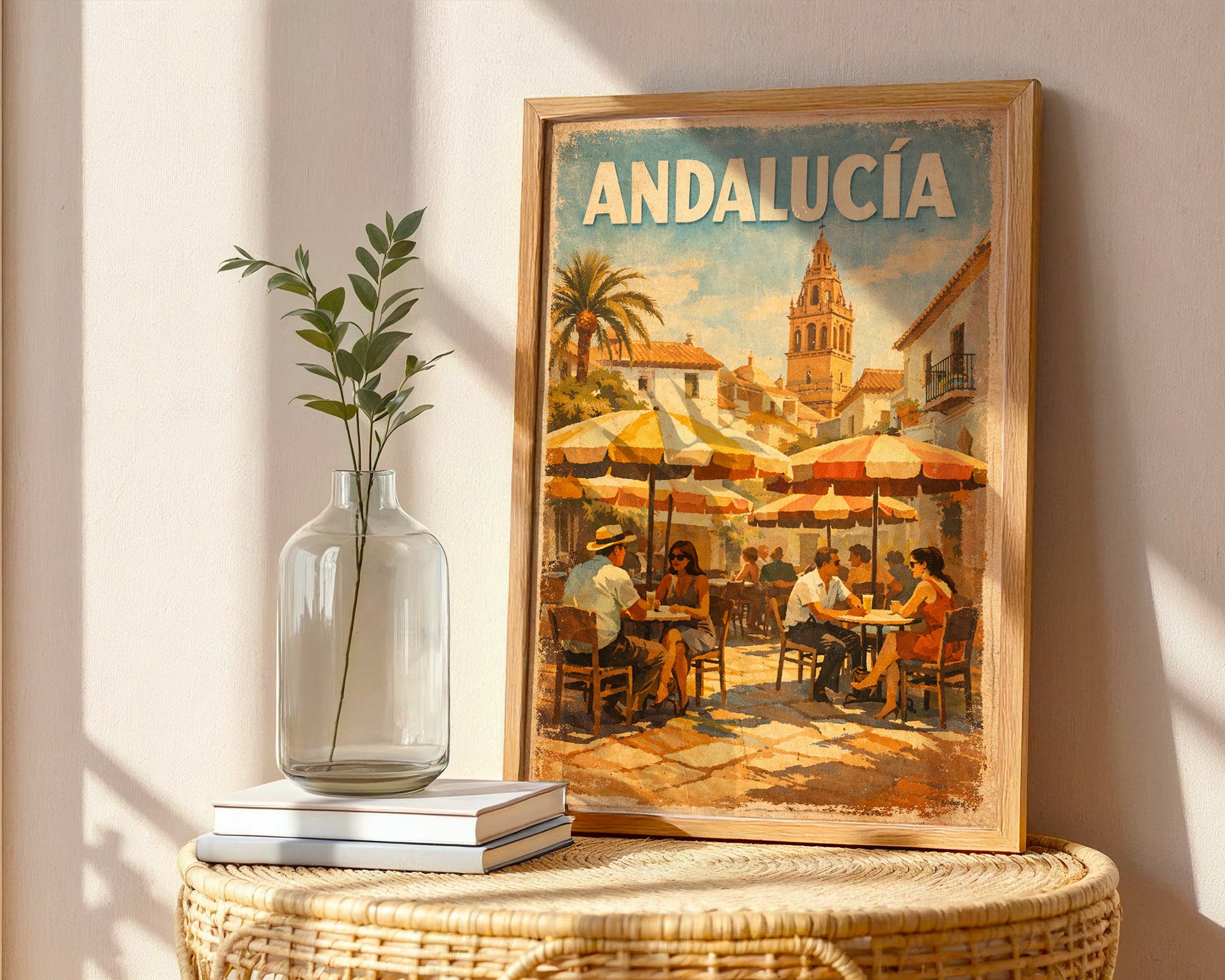Warm sun, café chatter, and timeless charm. This Andalucía Travel Poster captures the relaxed elegance of southern Spain with shaded terraces, historic architecture, and a laid-back Mediterranean atmosphere.