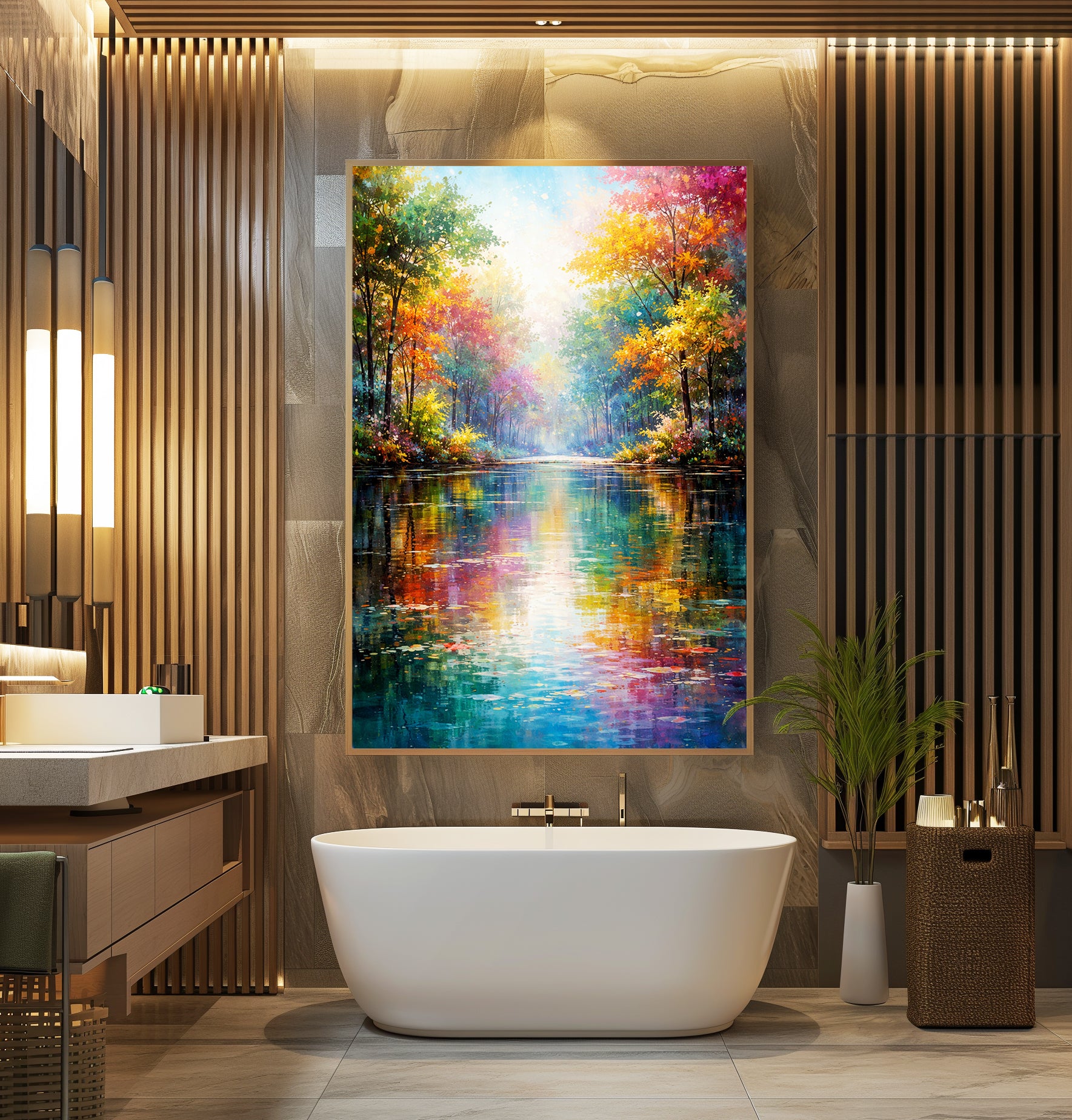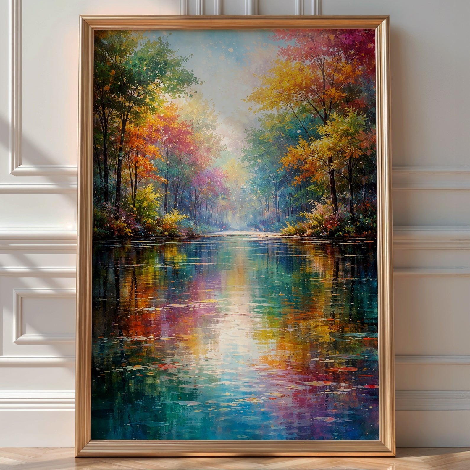 A peaceful riot of colour. This Autumn Forest Reflection Poster captures a painterly woodland glowing with fall foliage, mirrored in a serene river. Rich oranges, golds, and reds blur into cool blues and greens for a dreamlike take on the changing seasons.