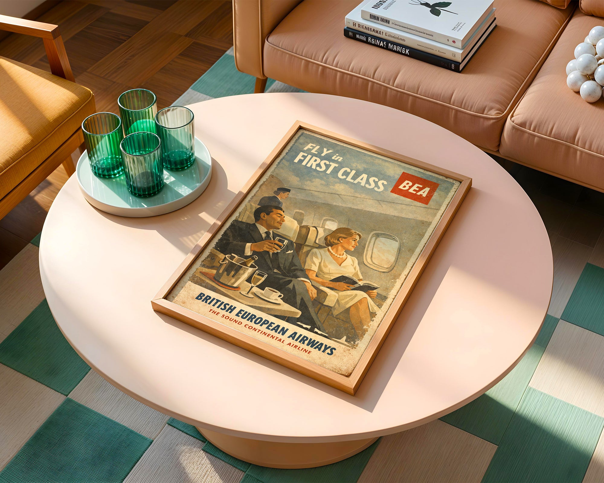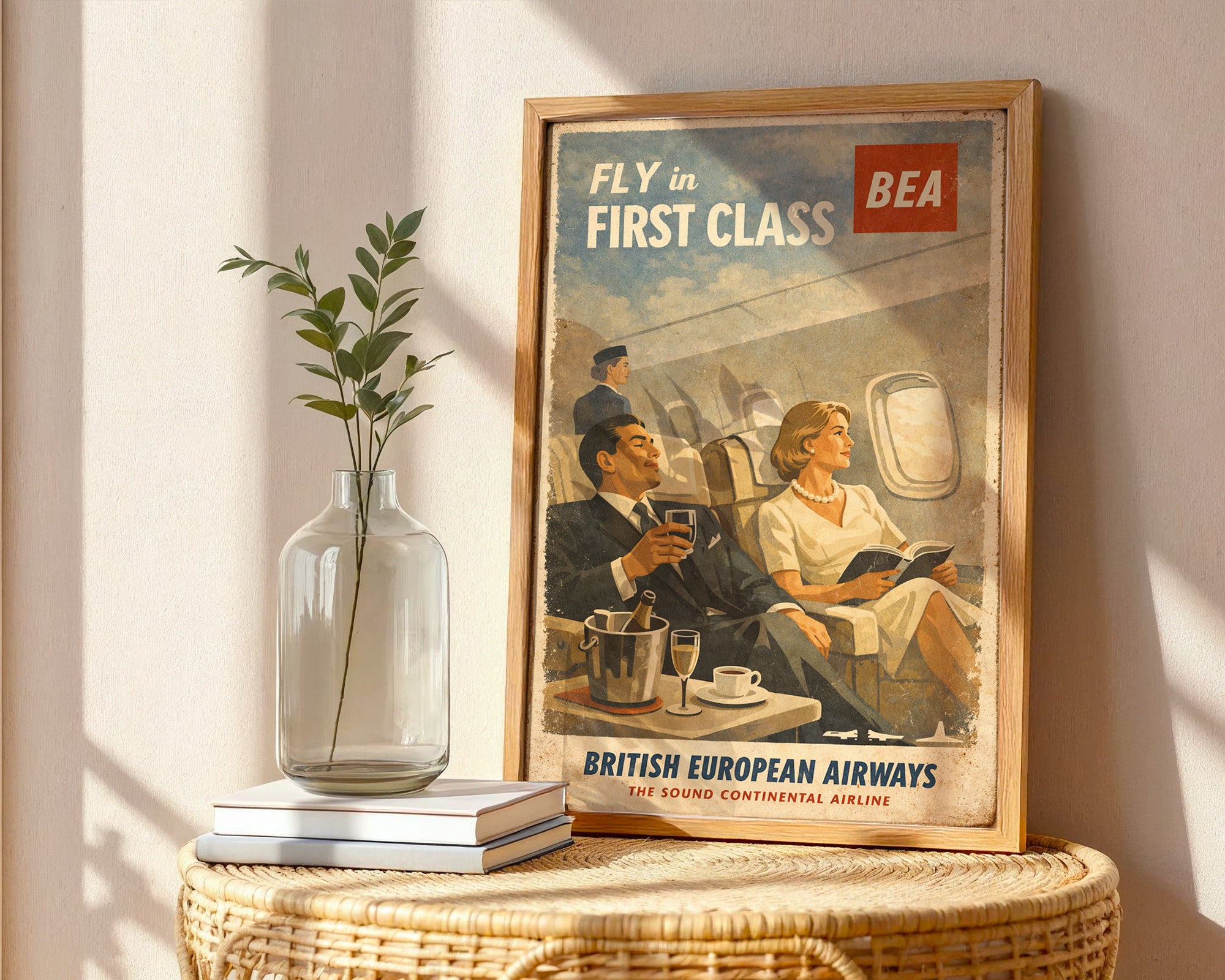 Sophisticated and refined, this BEA First Class Travel Poster transports you back to elegant skies and glamorous air travel. A stylish couple relaxes in plush seats while a flight attendant looks on, embodying mid‑century luxury.