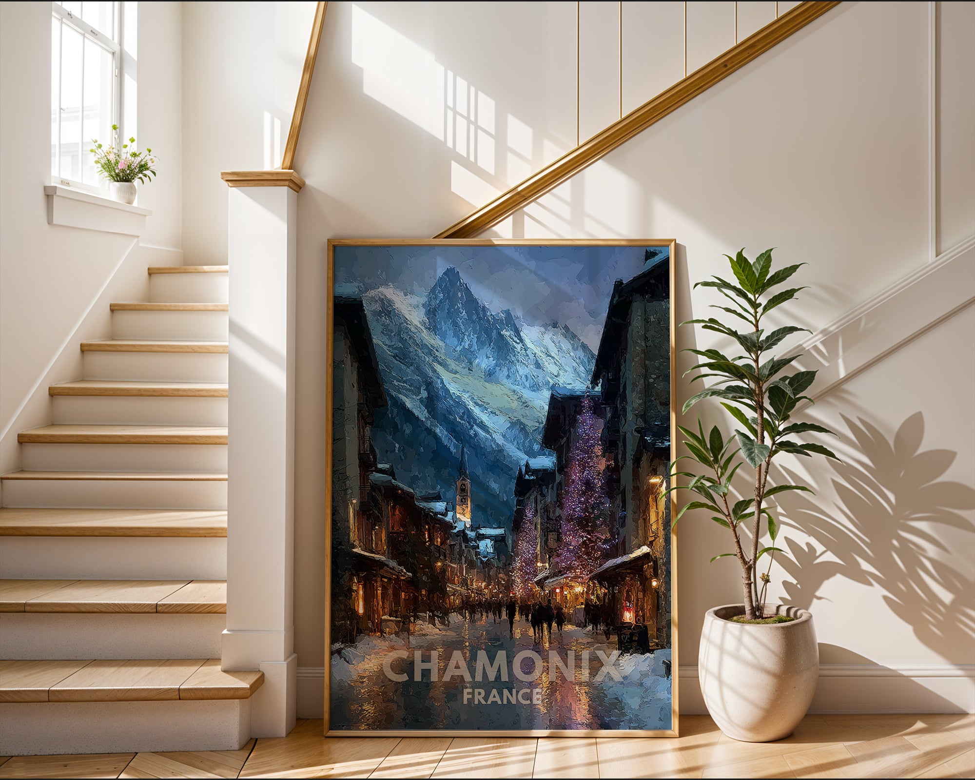 The magic of Chamonix, now with sparkle. This Chamonix Christmas Poster features purple-lit trees, bustling holiday streets, and majestic mountains in the background—pure alpine enchantment. The painterly texture gives it warmth, depth, and just the right amount of snow-dusted nostalgia.