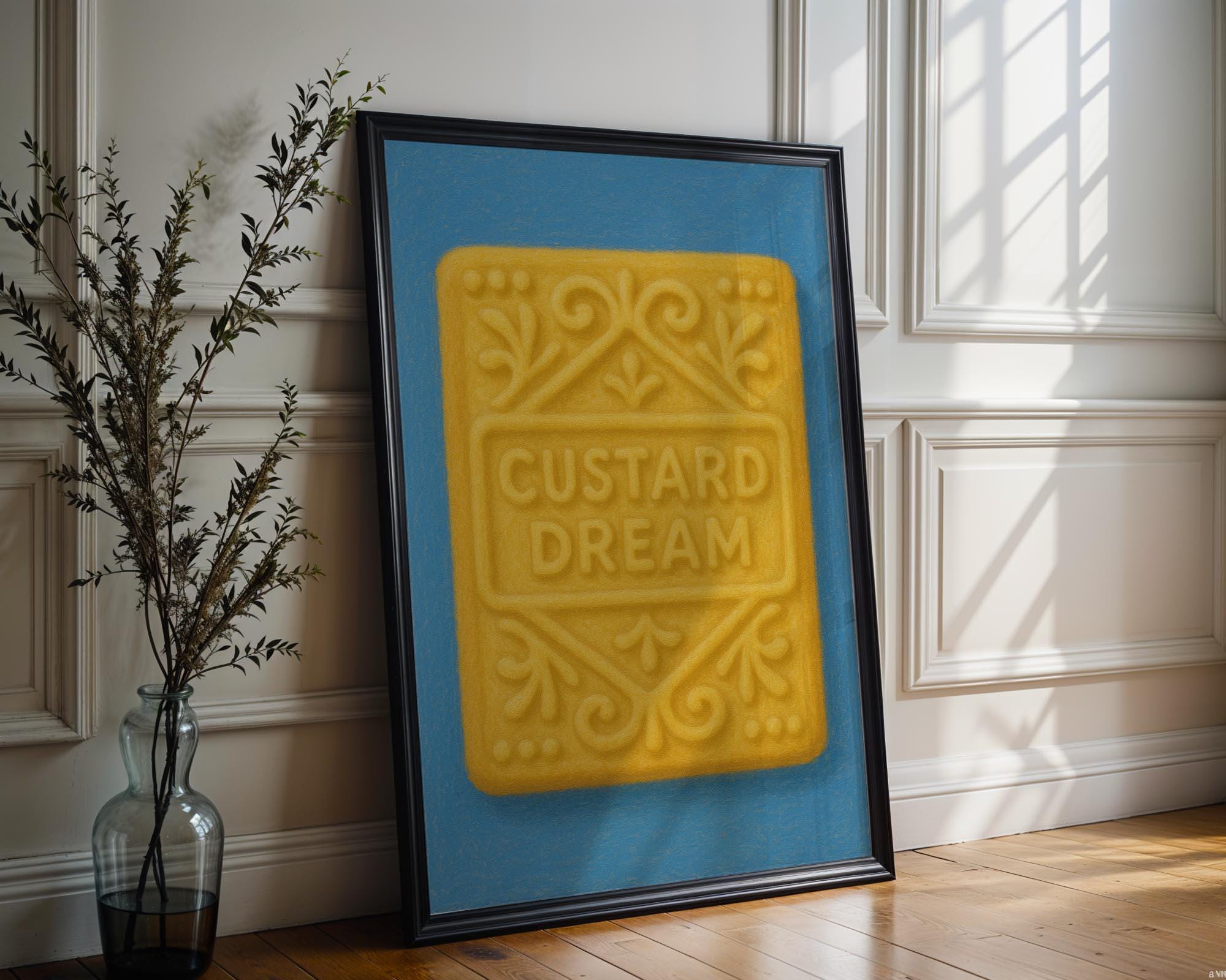 Perfect for kitchens, tea corners, or anywhere that needs a splash of playful energy, this poster is a dream for lovers of carbs, colour, and a bit of UK snack culture. With a vivid blue background that makes the golden custard pop, it's a quirky conversation starter and a gift-worthy gem.