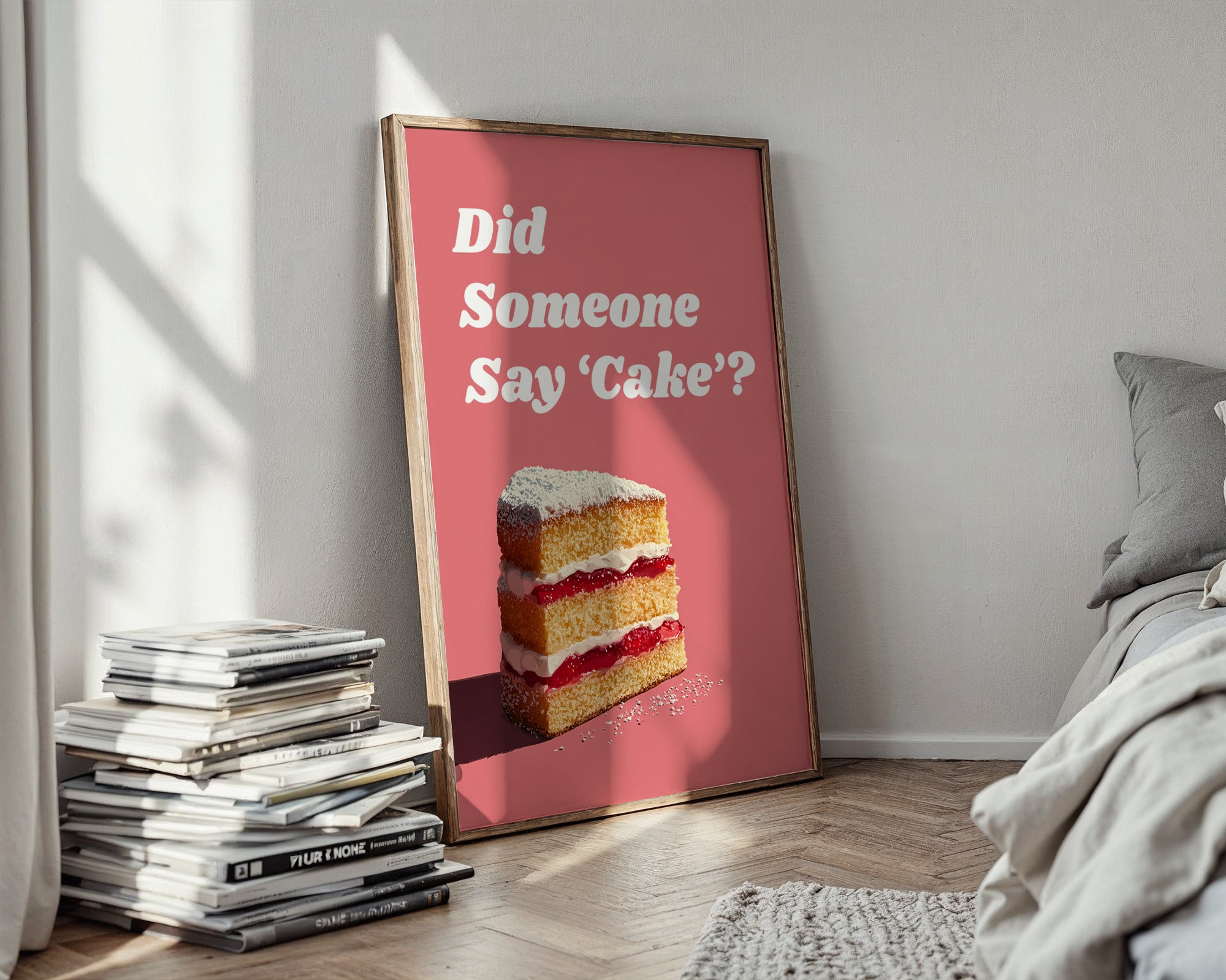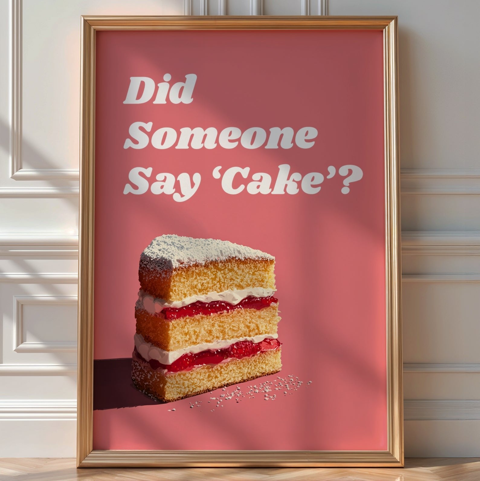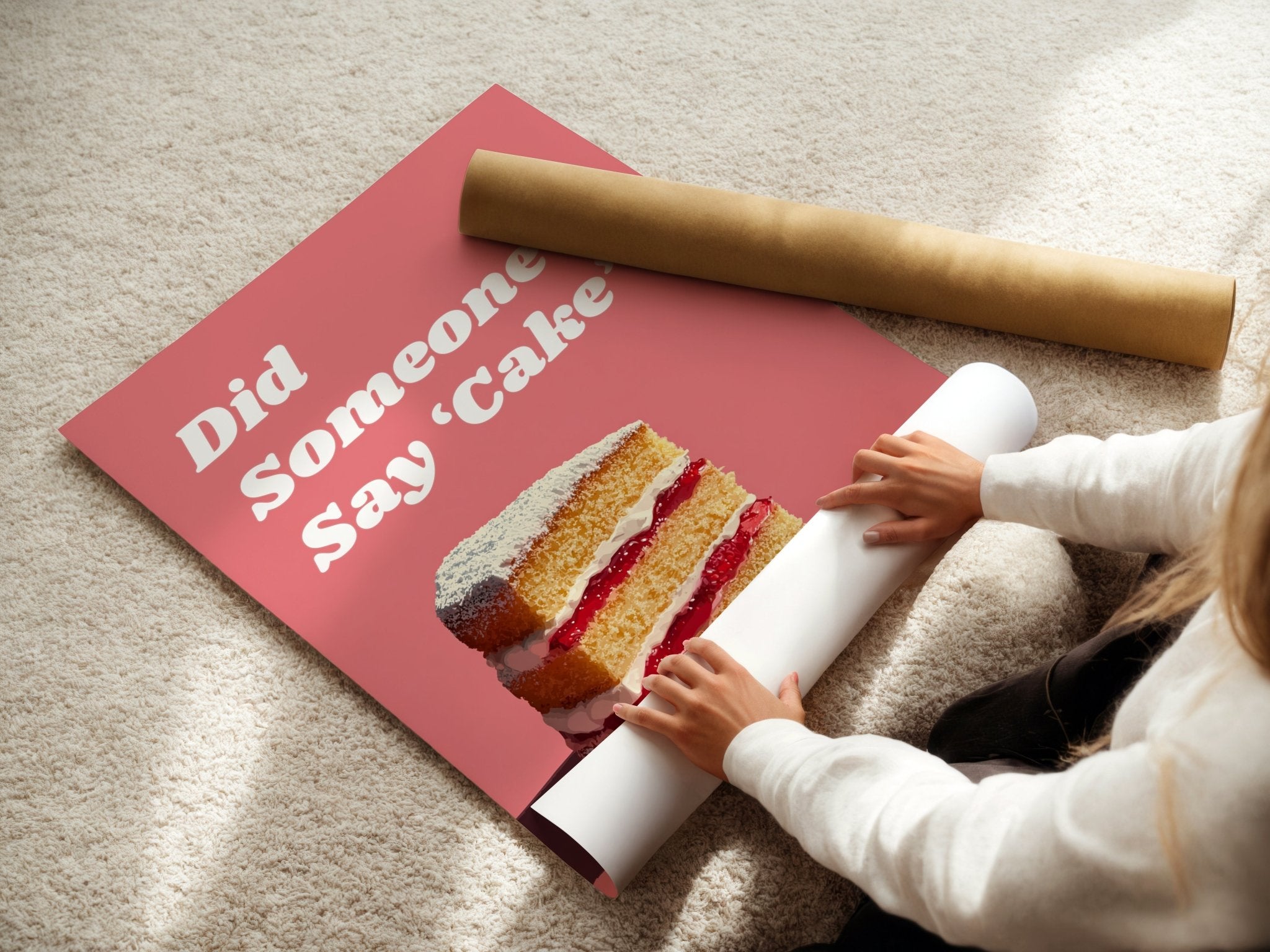 A slice of joy you can hang on your wall. This “Did Someone Say Cake?” print combines playful typography with mouthwatering sponge, cream, and strawberry layers—topped with powdered sugar. Perfect for kitchens, cafés, dining spaces, or as a gift for the cake-obsessed. Printed on premium 260gsm matte paper for vivid color and delicious detail. Always ships free, so you can enjoy your art as guilt-free as your dessert.