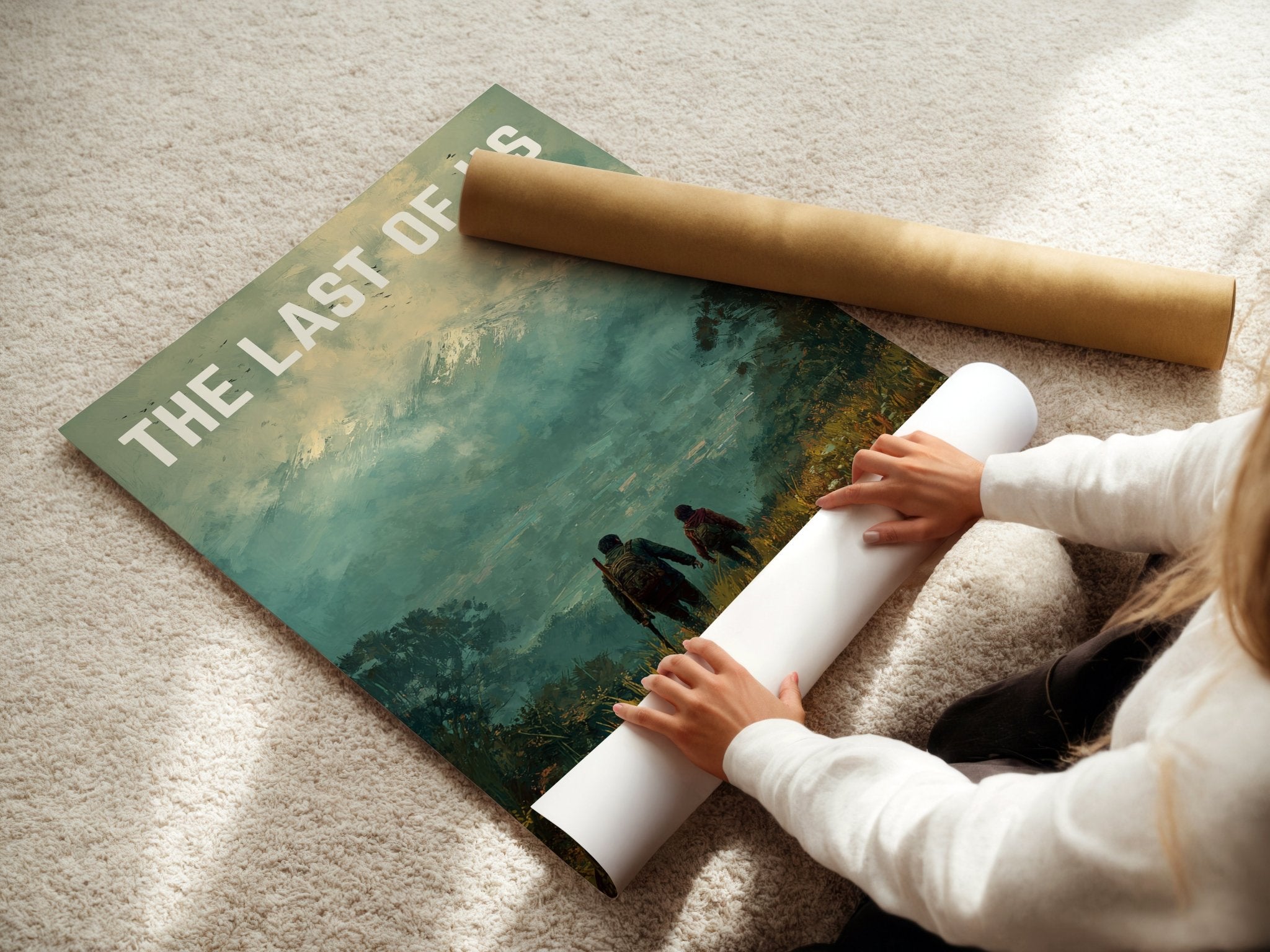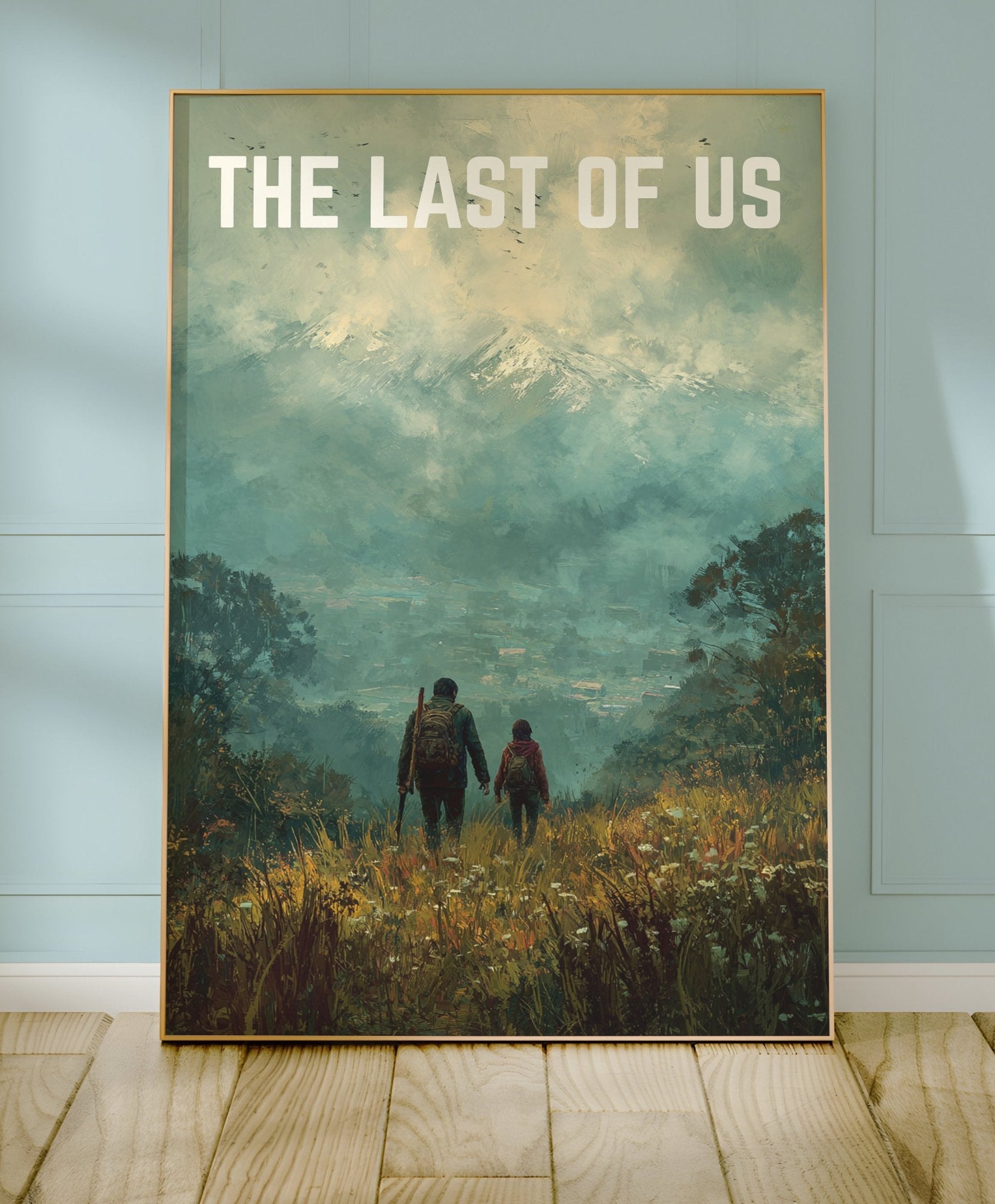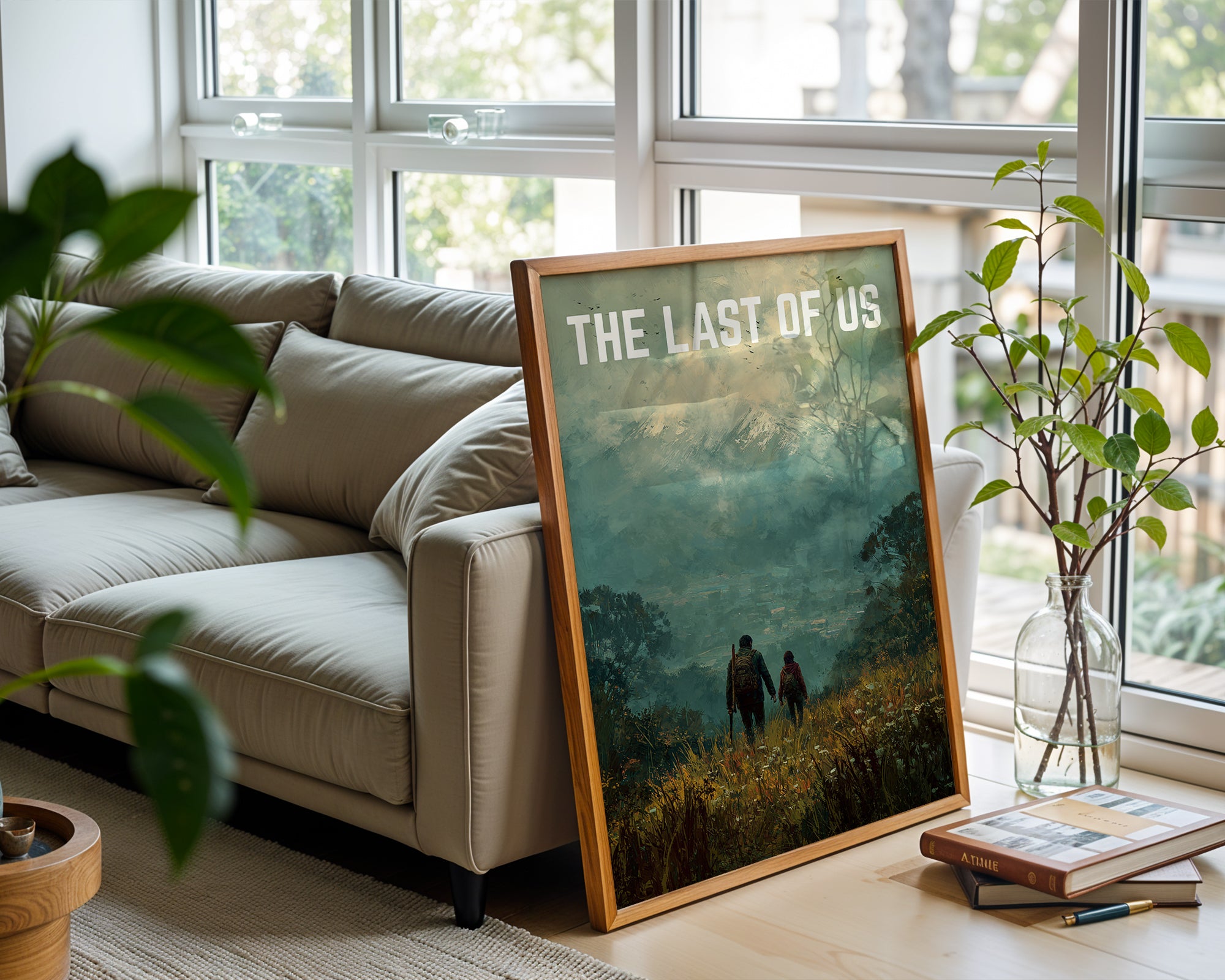 This cinematic art print drops you into a world that’s wild, worn, and weirdly beautiful. Inspired by post-apocalyptic storytelling, it captures two lone survivors—backpacks on, heads down, hearts heavy—trekking toward the unknown. Mist blankets the valley, the mountains loom like ancient gods, and the wildflowers keep growing anyway.