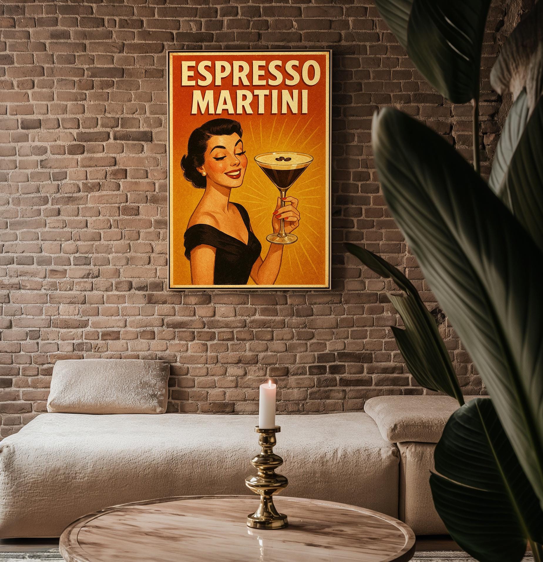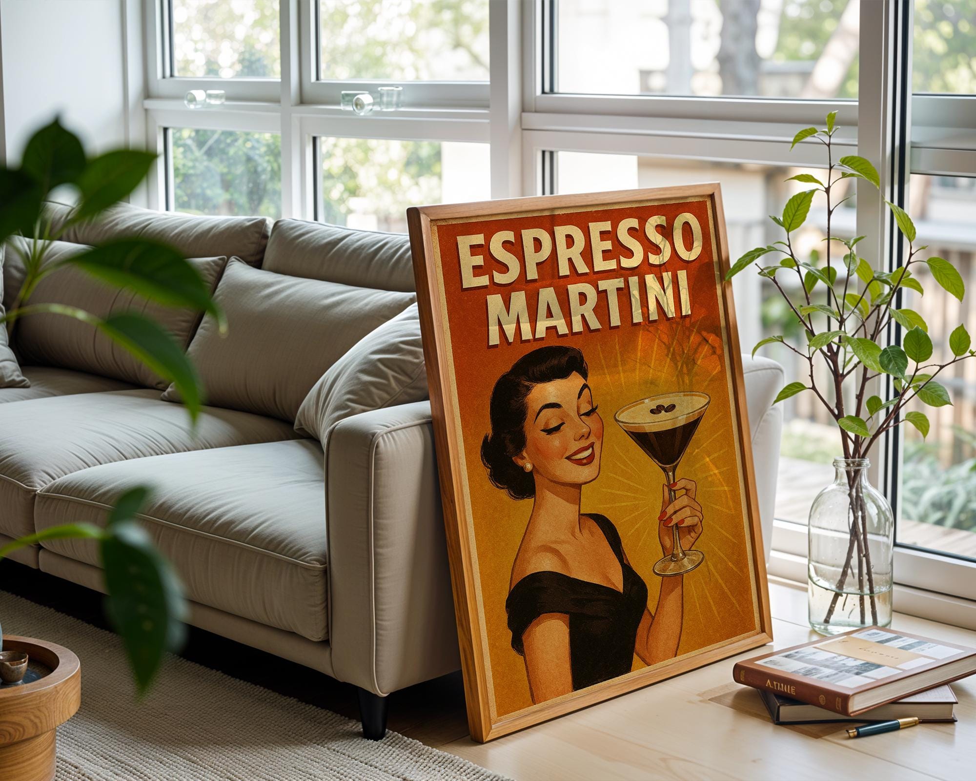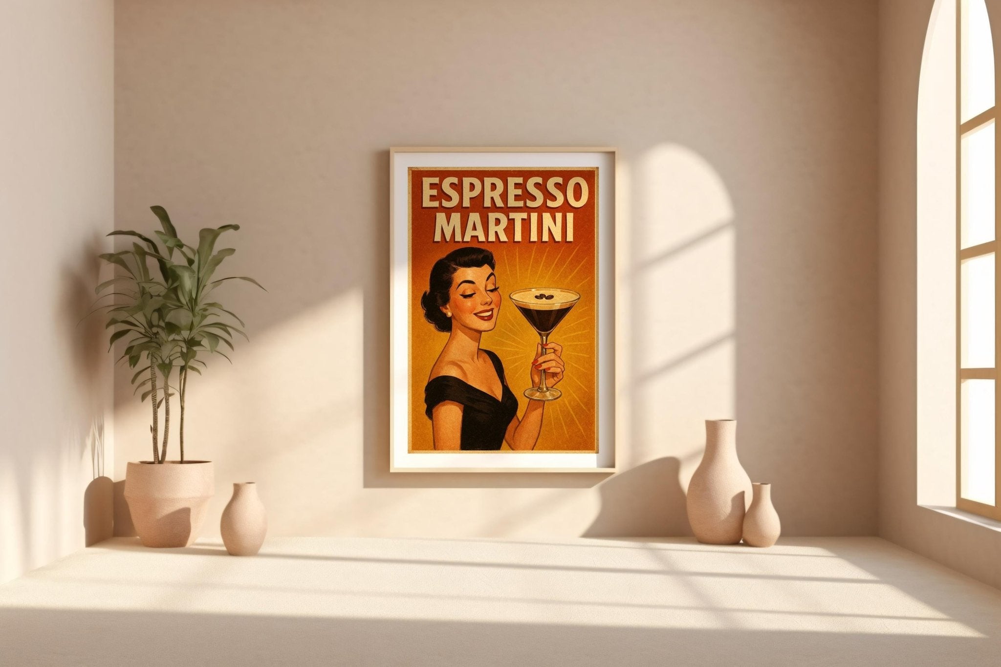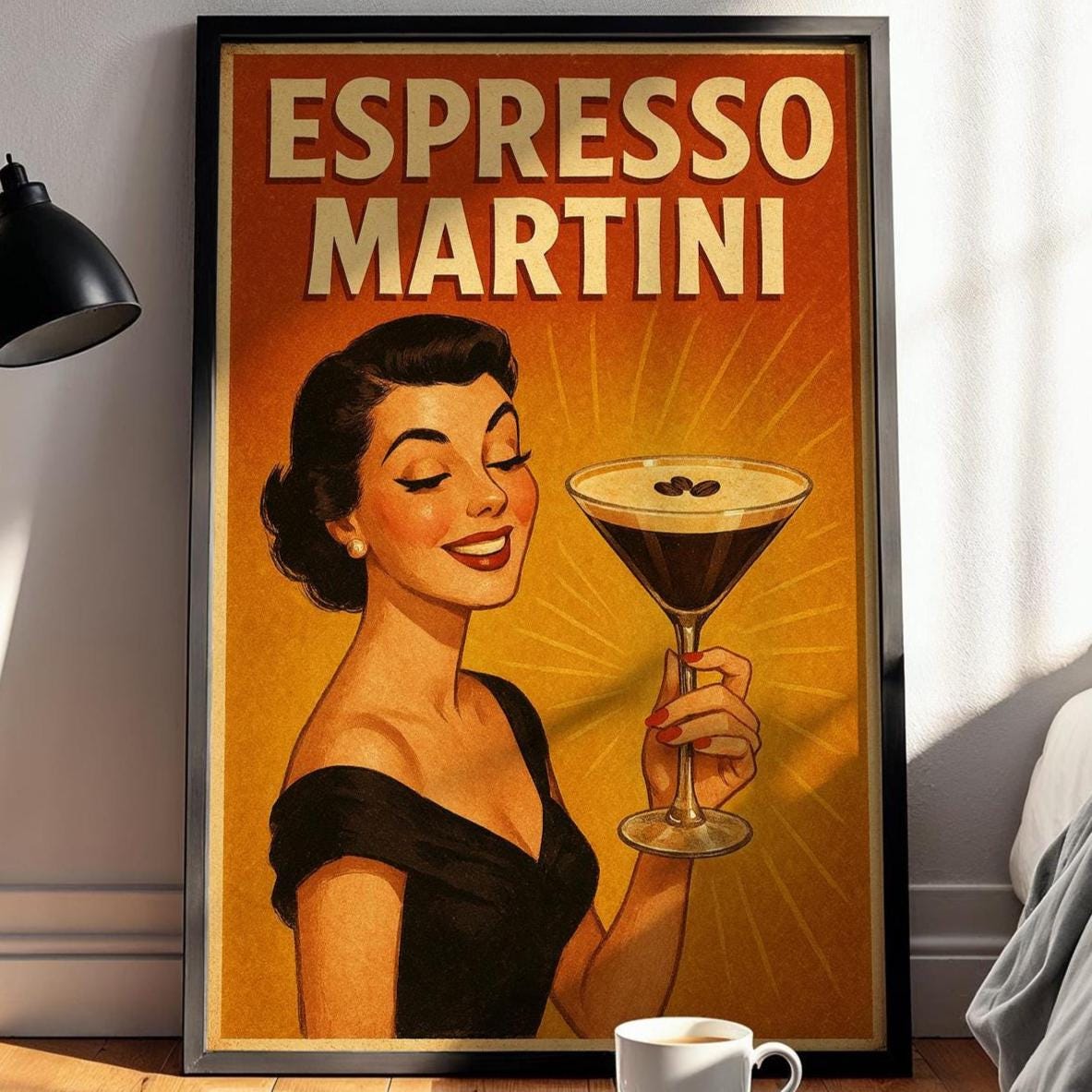 Designed with a warm, golden palette and midcentury flair, it's a love letter to that unbeatable combo: coffee + cocktail. Printed on luxe 260gsm matte paper and shipped free, it's a must-have for espresso martini fans, cocktail connoisseurs, or anyone who likes their wall art with a side of sass.
