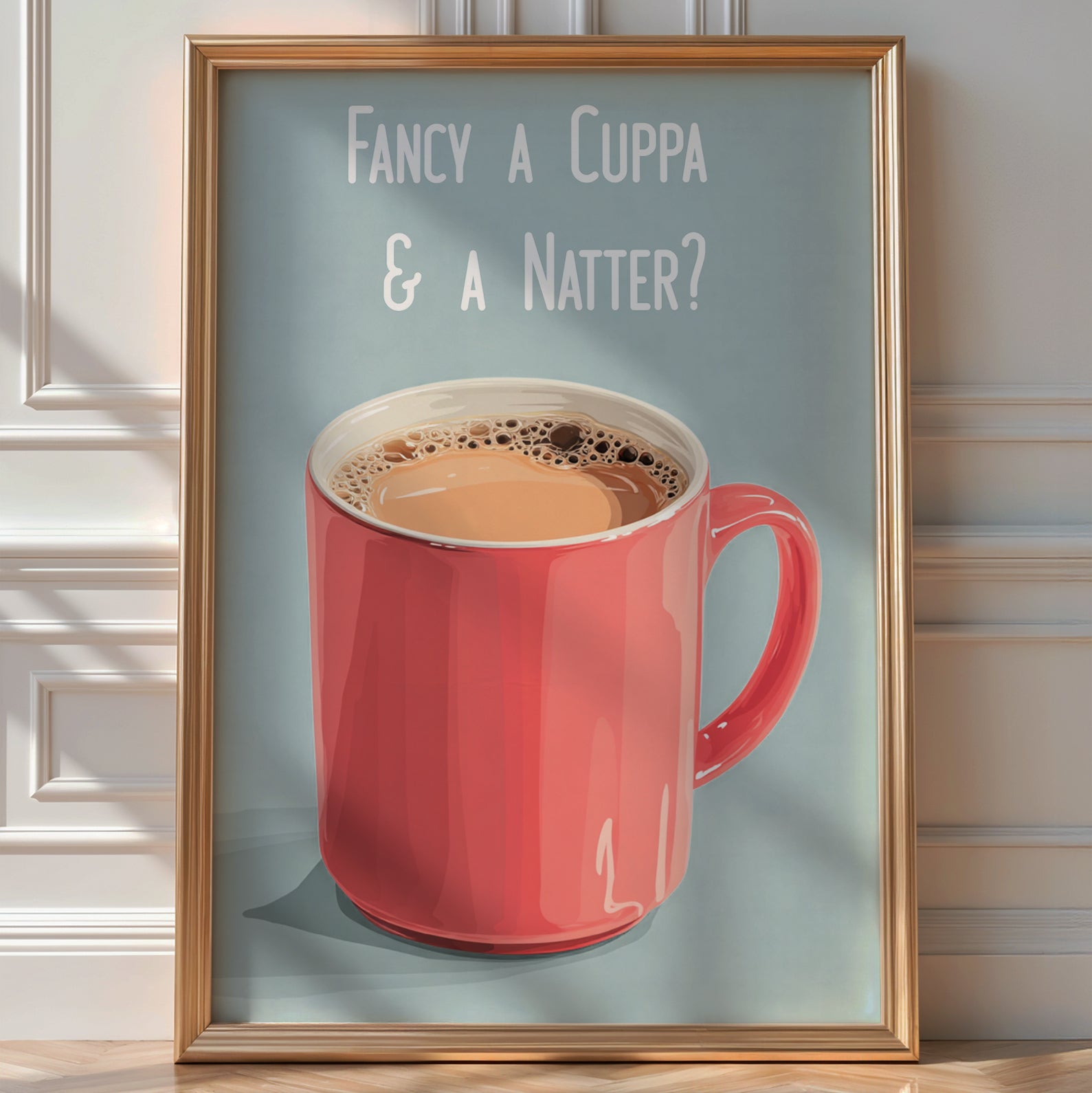 Warm vibes guaranteed with Fancy a Cuppa & a Natter—a poster that’s basically a hug in print. Soft colours, friendly lettering, guaranteed to spark chats. Hang it in kitchens, living rooms, halls, or your favourite tea corner.