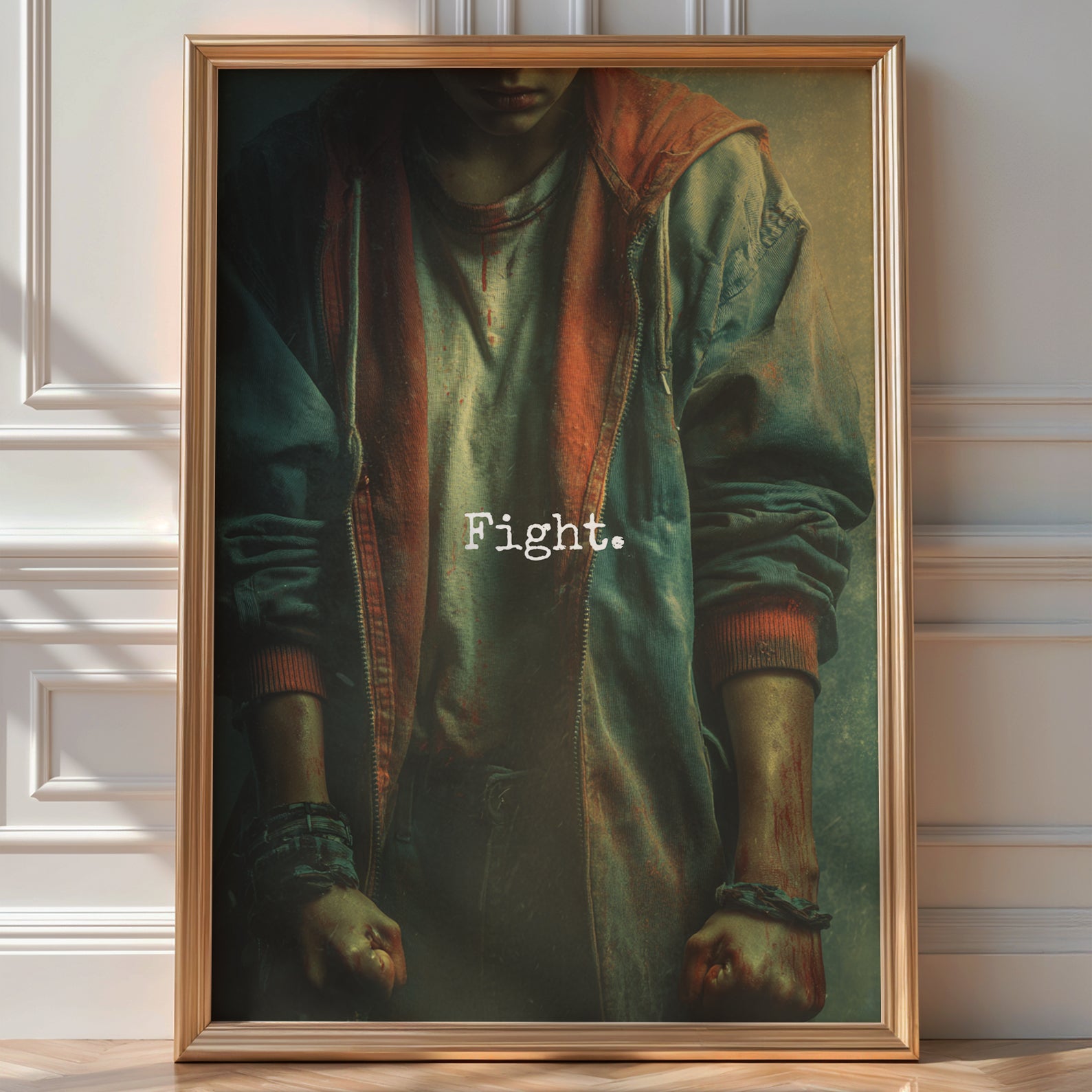 With a cool retro 80s vibe this one’s not here to whisper. It’s here to roar. A powerful image of defiance, survival, and grit—this poster captures the moment just before the punchline of resistance. Urban textures, bloody knuckles, and raw emotion come together in a visual gut-punch.