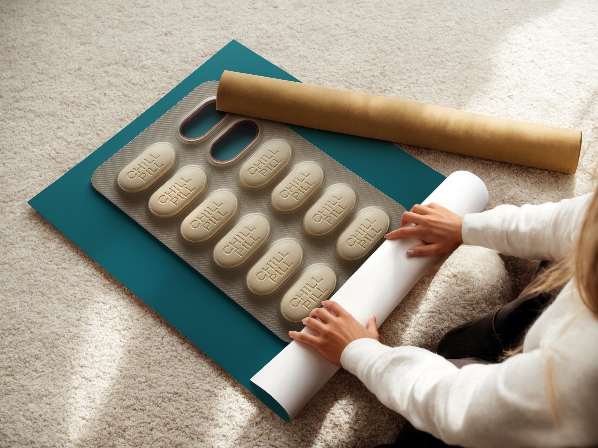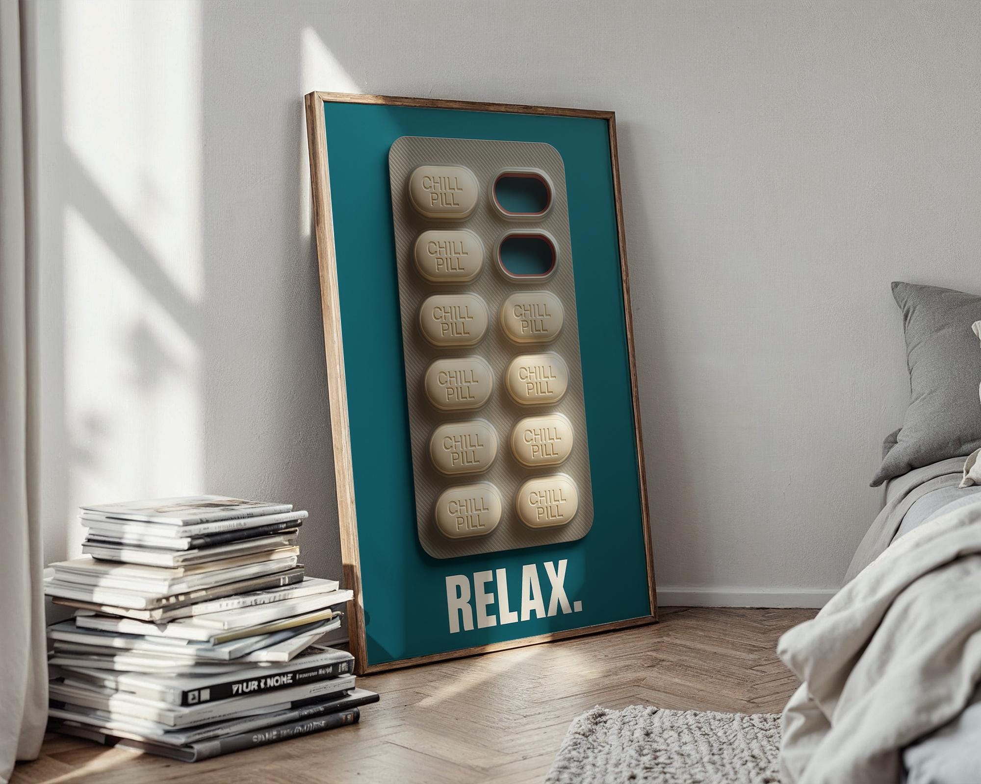 Perfect for an office that needs some irony, a bathroom that could use a smile, or a dorm room that wants to stand out, this poster is equal parts graphic punch and clever commentary. The faux blister pack of "Chill Pills" pops against a teal background, with subtle 3D detailing that makes it feel just a little too real (in the best way).