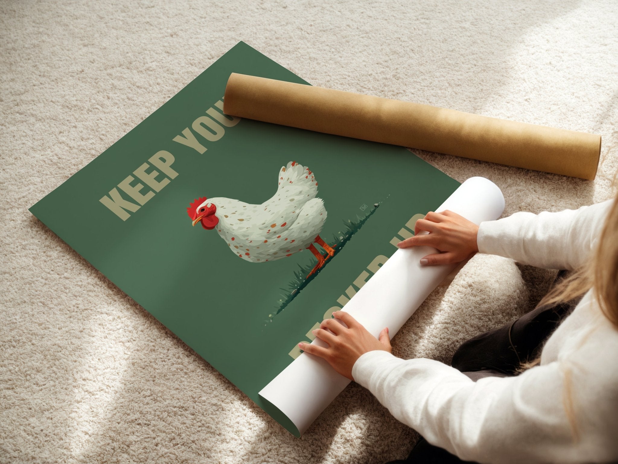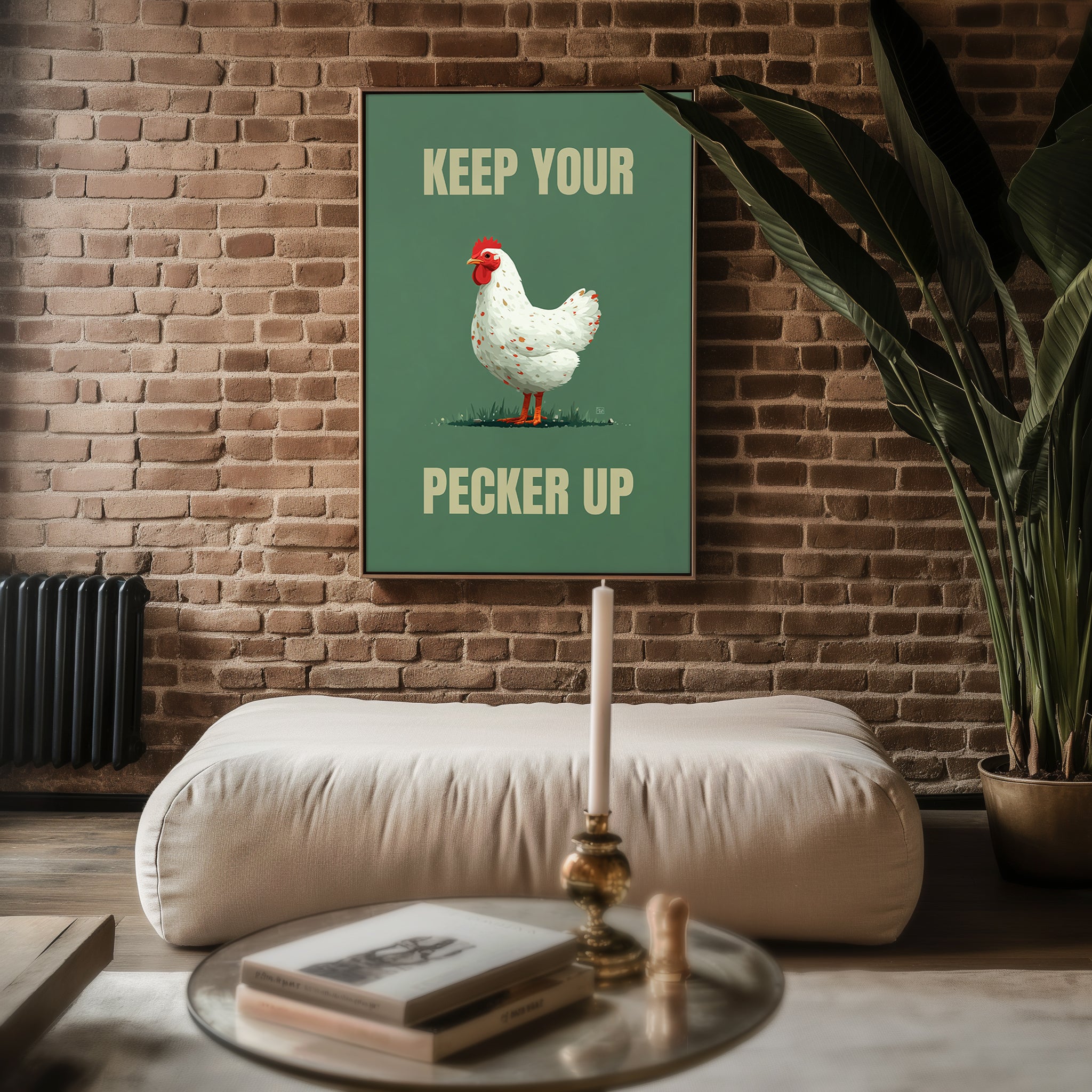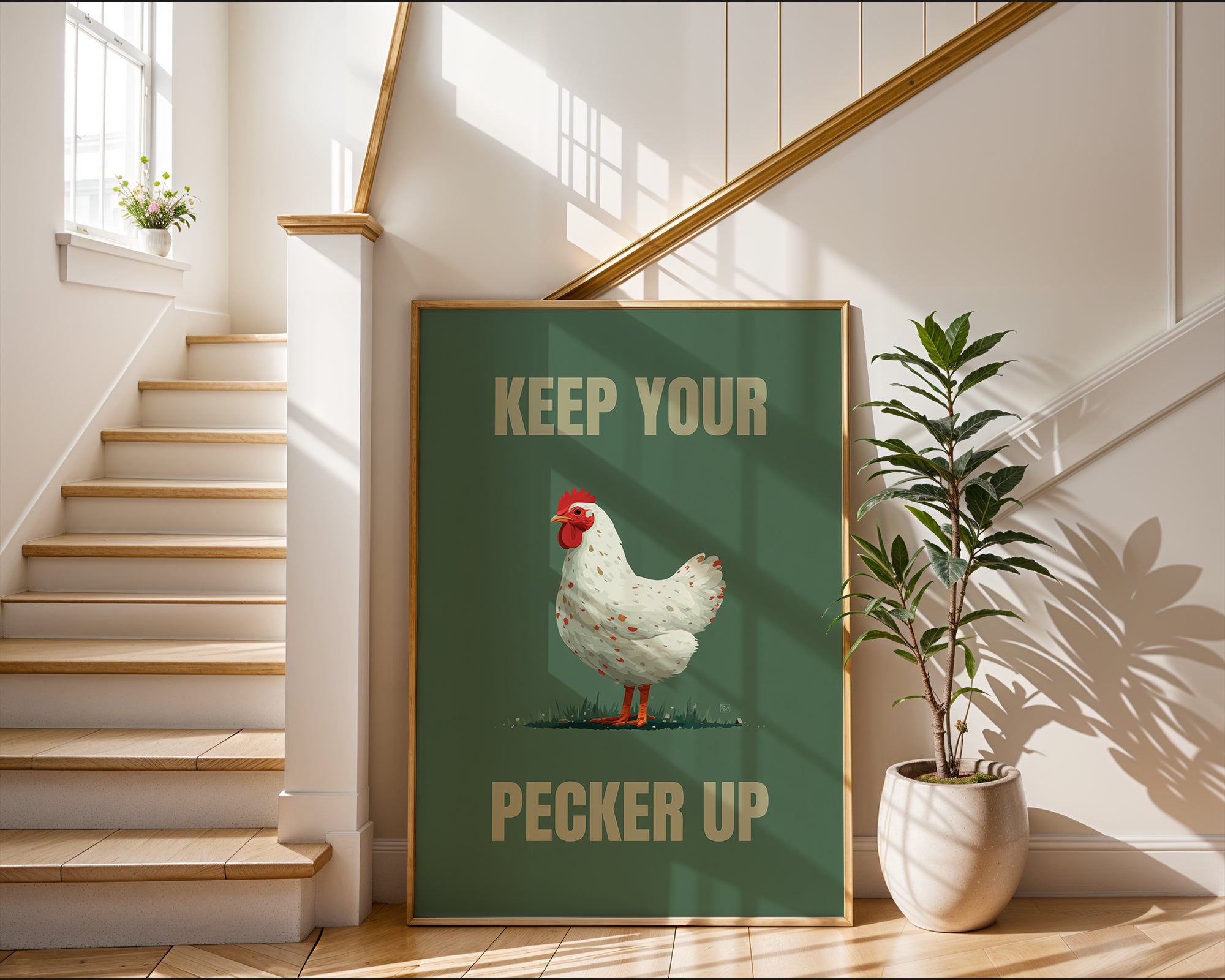 Nothing like a bold bird and a cheeky phrase to pep up your walls. Our "Keep Your Pecker Up" chicken poster blends classic countryside charm with a wink of humour. It’s a motivational pun that walks like a joke and clucks like art — ideal for kitchens, farmhouse spaces, chicken lovers, or anyone who could use a pick-me-up with personality.