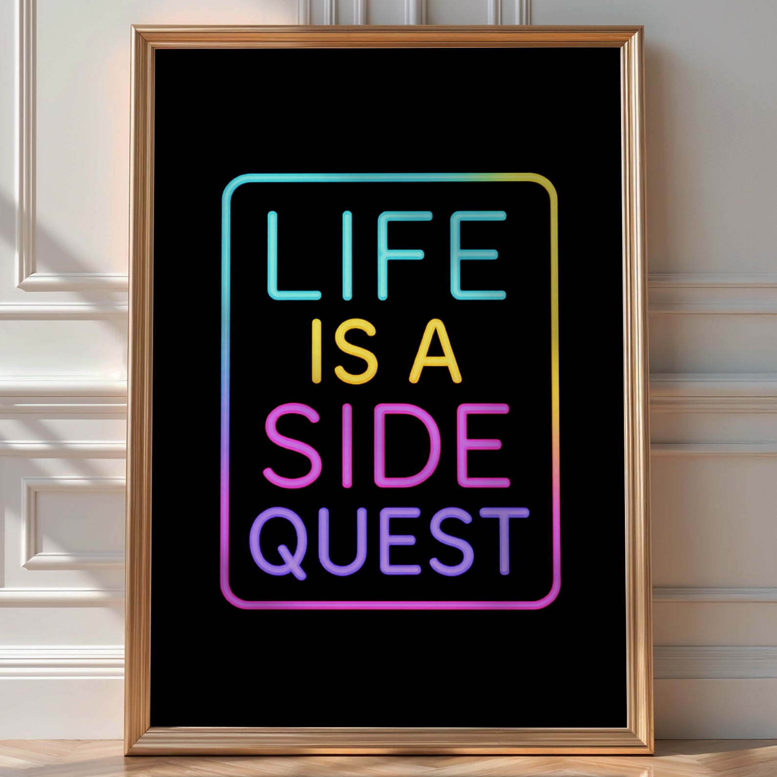 The main storyline can wait. This vibrant neon print celebrates the side quests—where the real fun happens. In rainbow glow text, it’s perfect for gamers, creatives, and chaos connoisseurs alike.