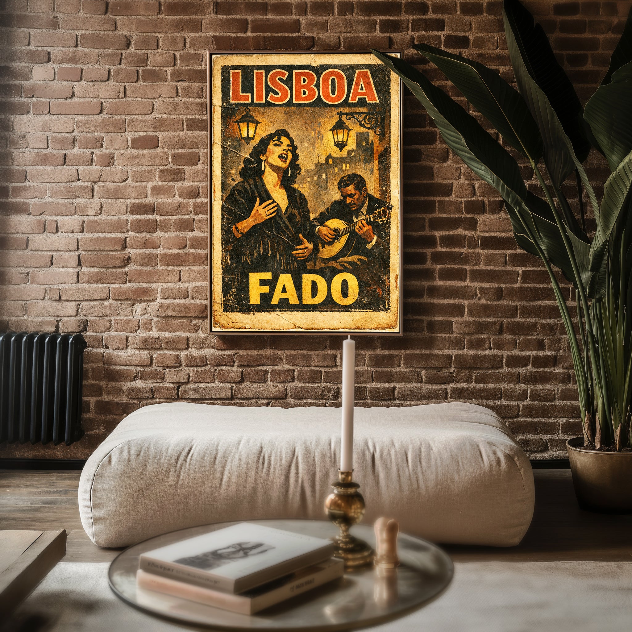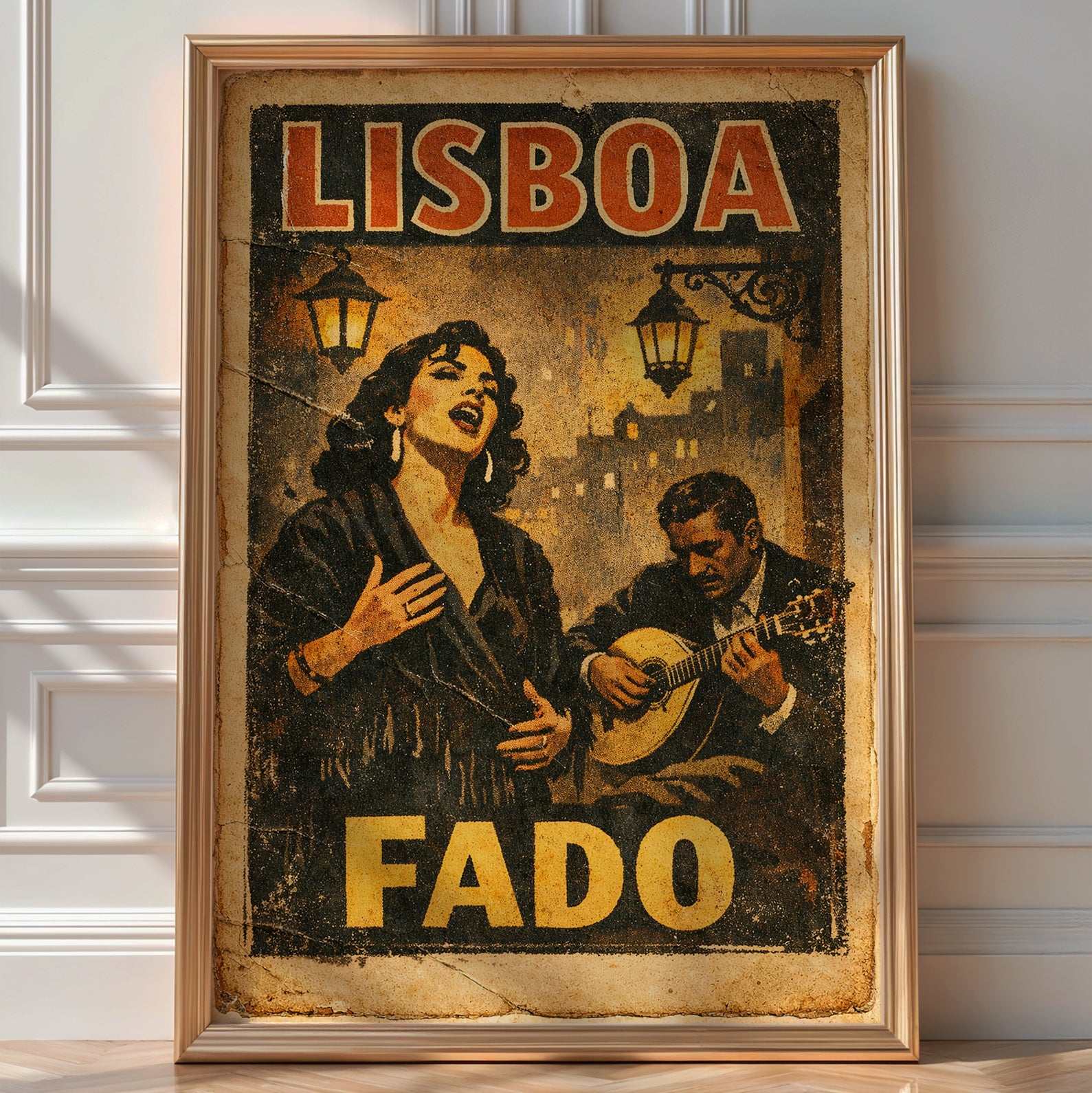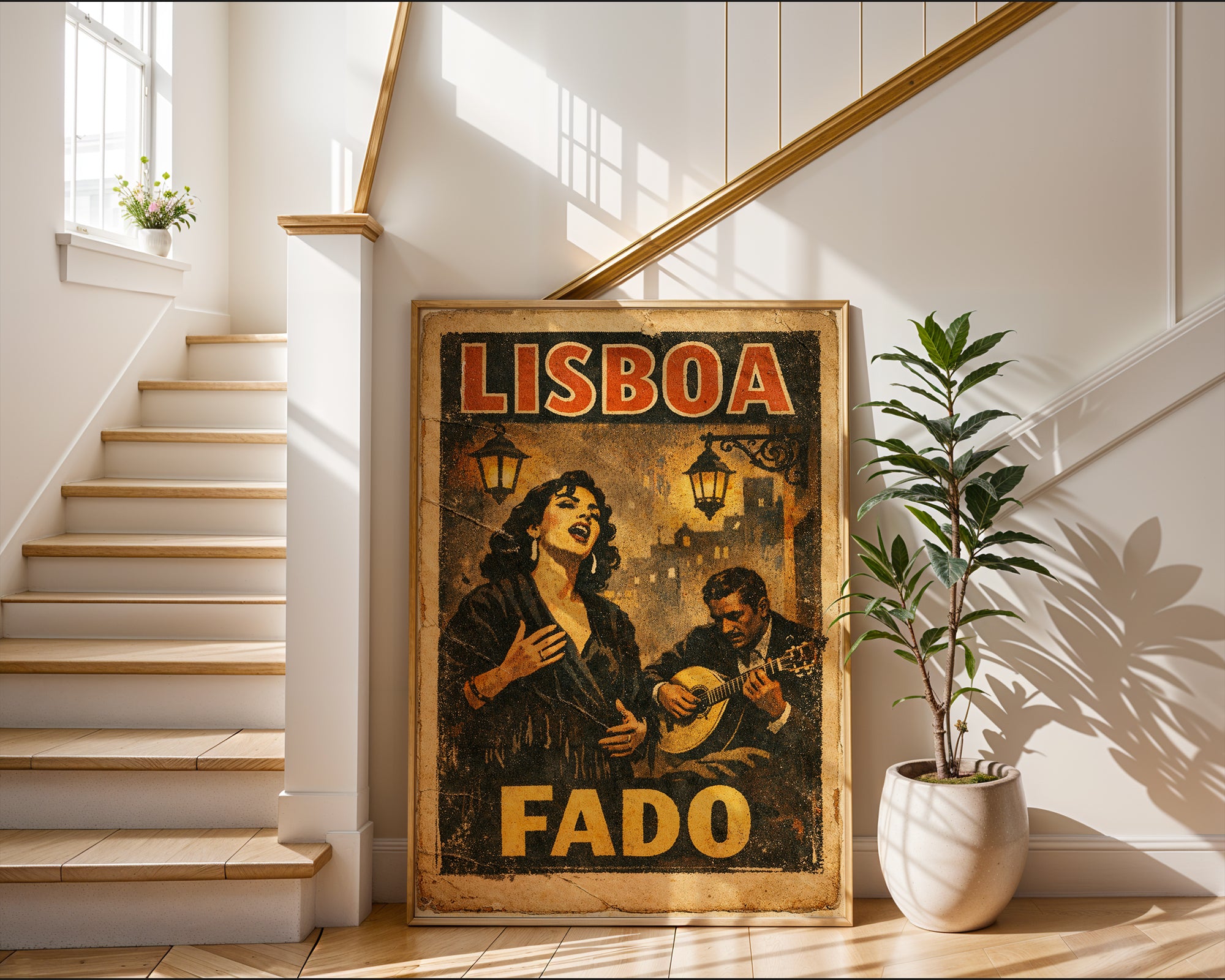Soulful, emotional, and timeless. This Lisboa Fado Poster captures the heart of Portugal’s most iconic music tradition. A powerful singer and guitarist emerge from warm, textured tones, evoking late nights, candlelight, and deep emotion.