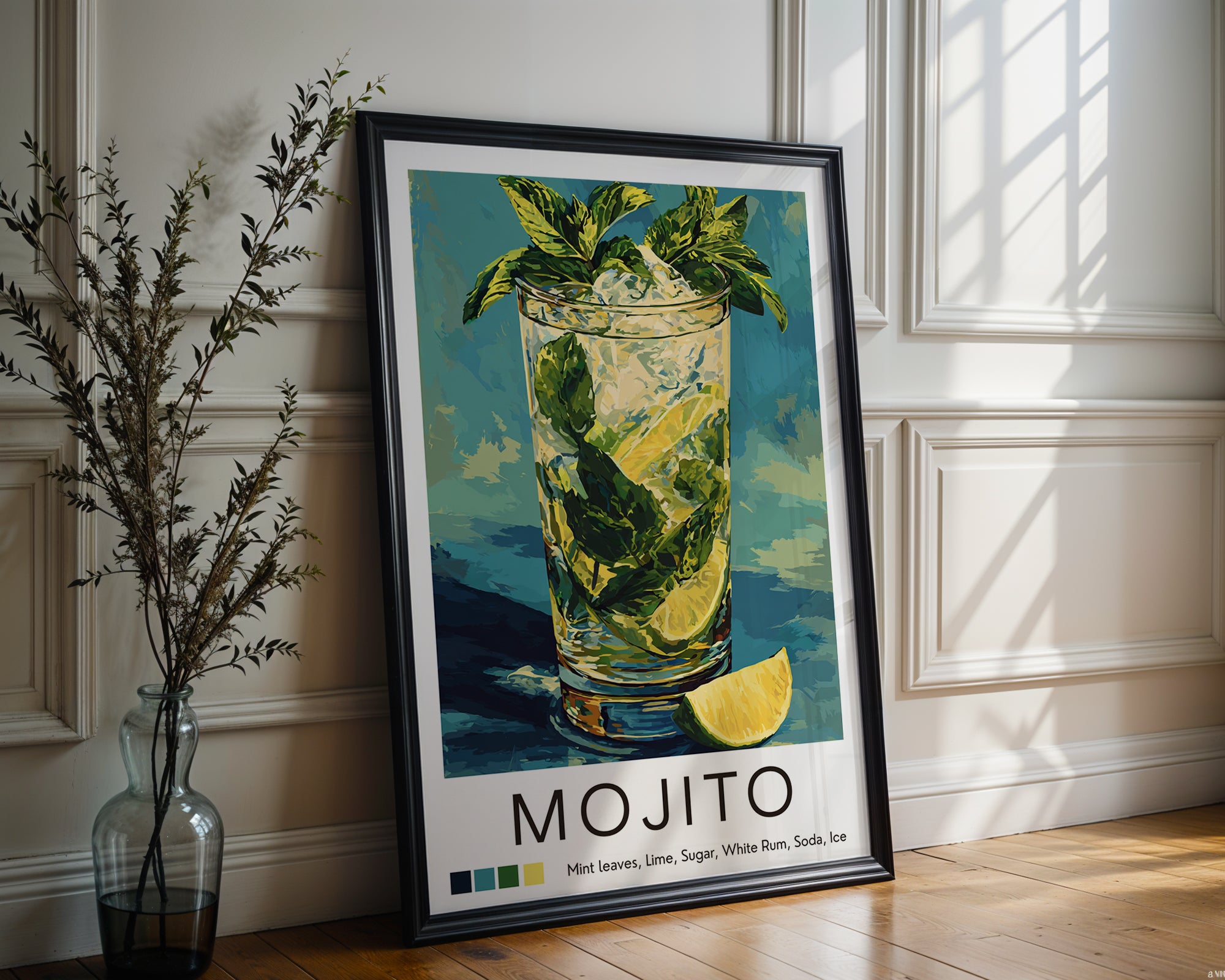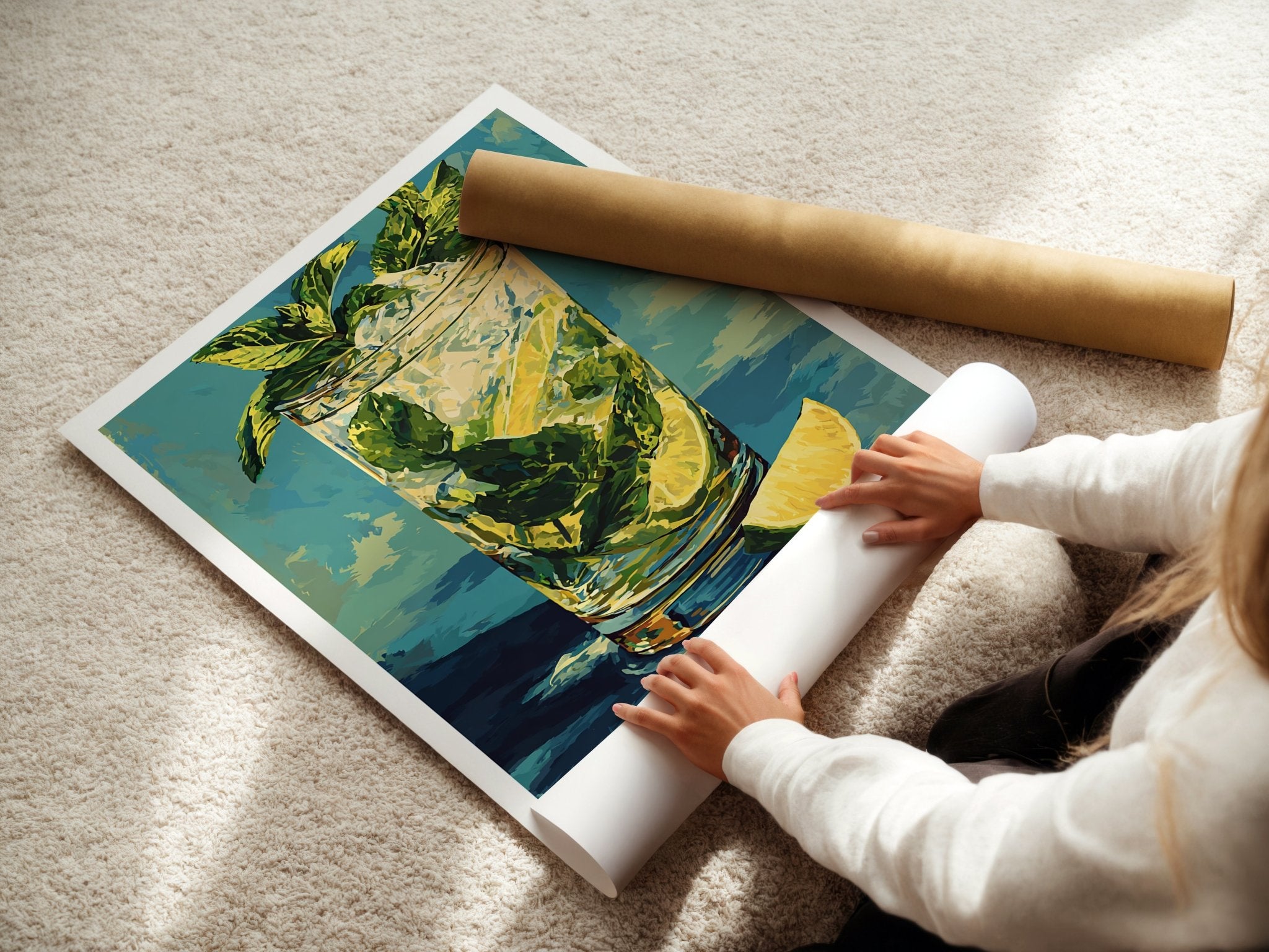 Quench your decor cravings with this vibrant Mojito art print—lush mint leaves, zesty lime wheels, sweet sugar, white rum, fizzing soda, and sparkling ice—all fused in high-resolution painterly style. This print taps into cocktail culture, bar cart aesthetics, and summer vibes—making it perfect for kitchens, home bars, or beach houses. Printed on premium 260 gsm paper with archival-grade inks for gallery-quality color and durability. And yep—shipping's always on us.