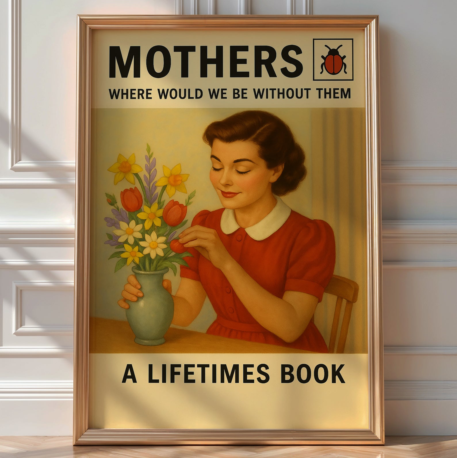 The bold headline-"MOTHERS: Where would we be without them"-does all the heavy lifting. Underneath, the image of a perfectly coiffed woman in a cherry red dress calmly tending to a fresh bouquet sets the tone: sincere admiration, with just enough retro flair to make it fun.