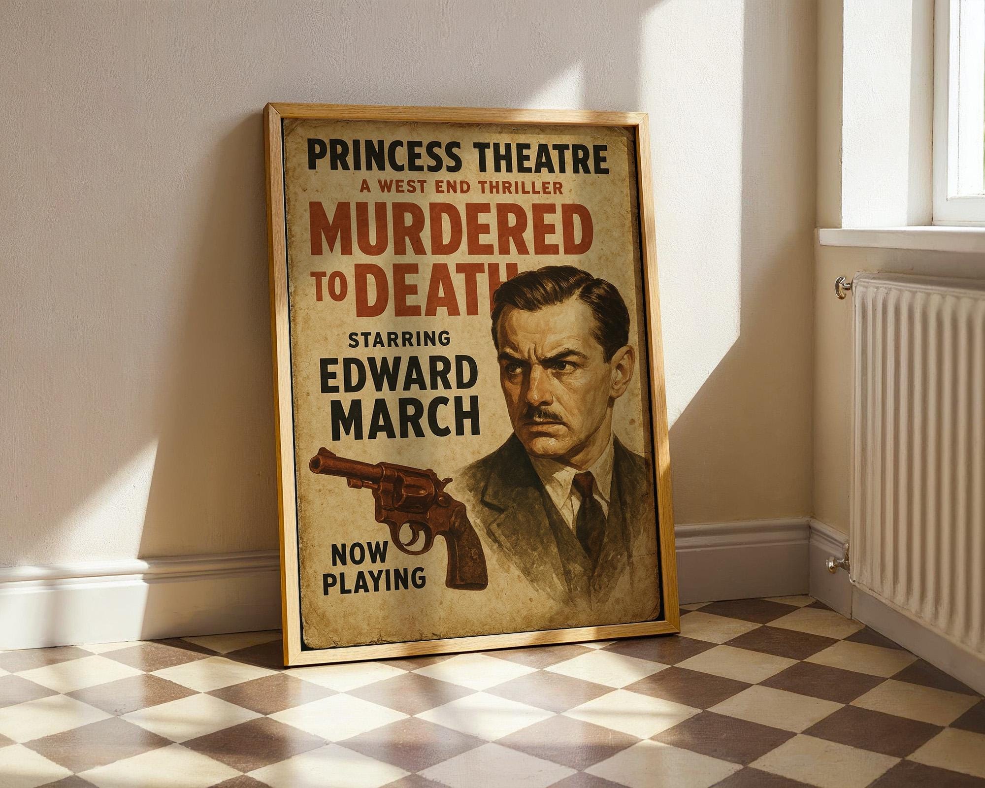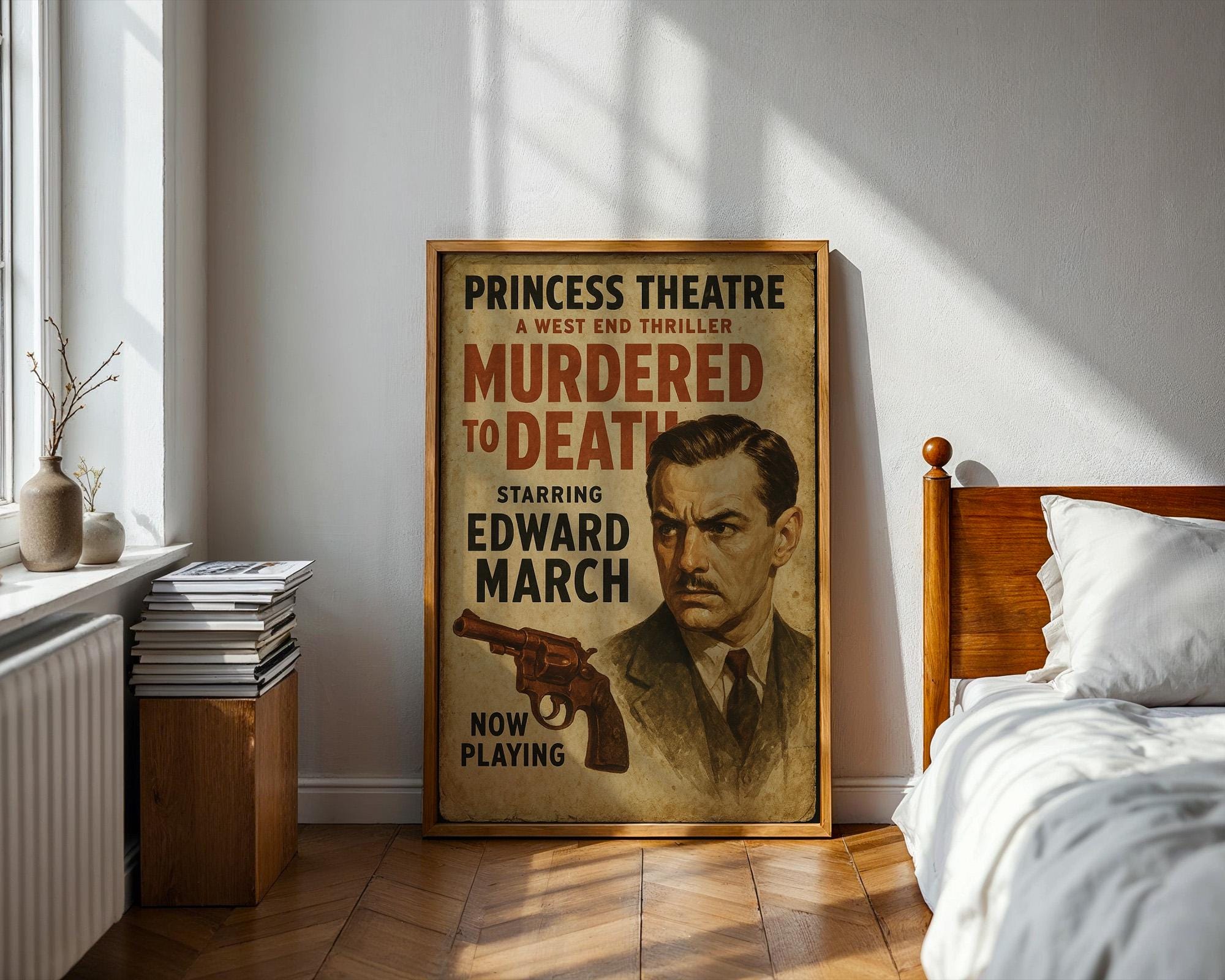 Murdered to Death Poster – West End Mystery Playbill Print, Retro Detective Drama Wall Art
