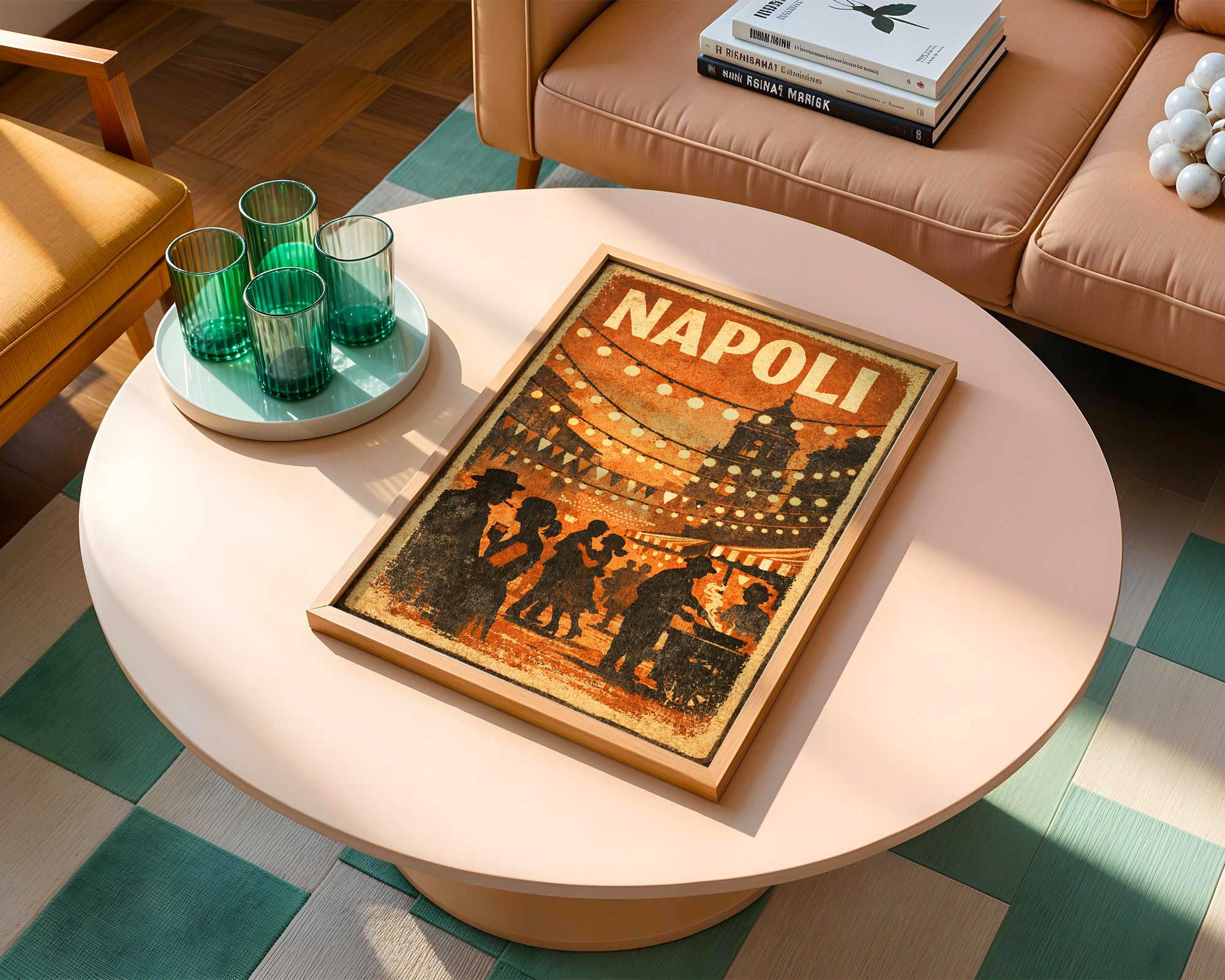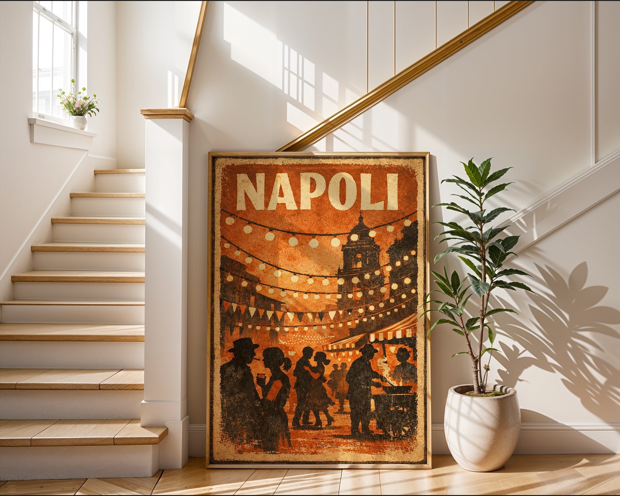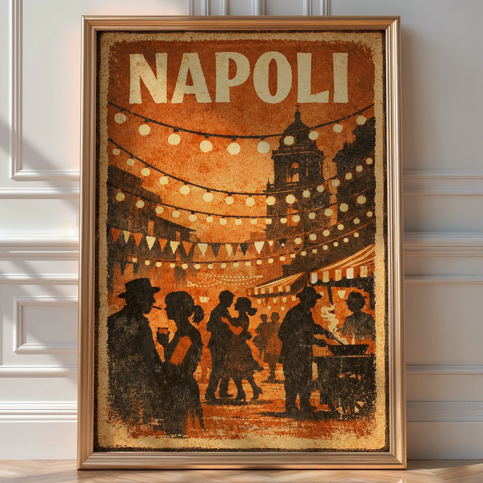 Warm lights, music, and movement fill the streets. This Napoli Street Festival Poster captures the lively soul of Naples with glowing lanterns, bustling crowds, and classic Italian atmosphere.