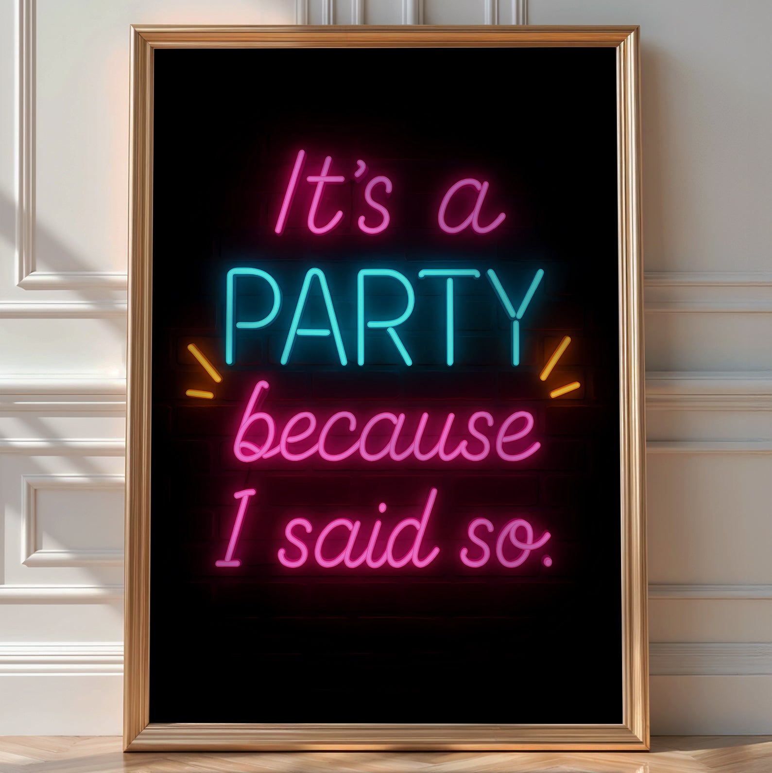 Own the vibe with this bold neon quote poster that says what everyone's thinking: It’s a party because I said so. With electric pink and blue lettering against a black backdrop, this print brings high-energy attitude to any room—no plug needed.