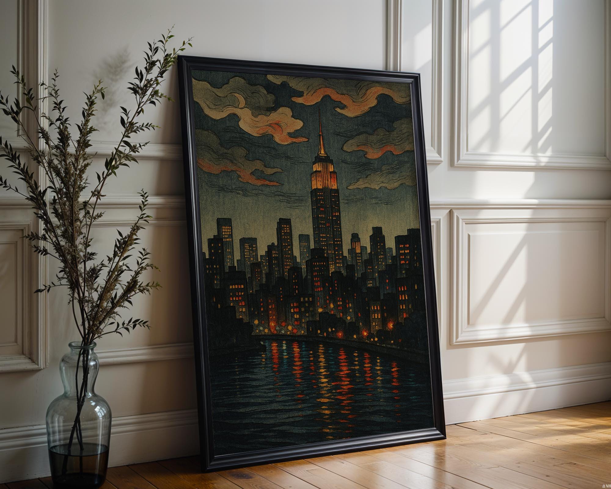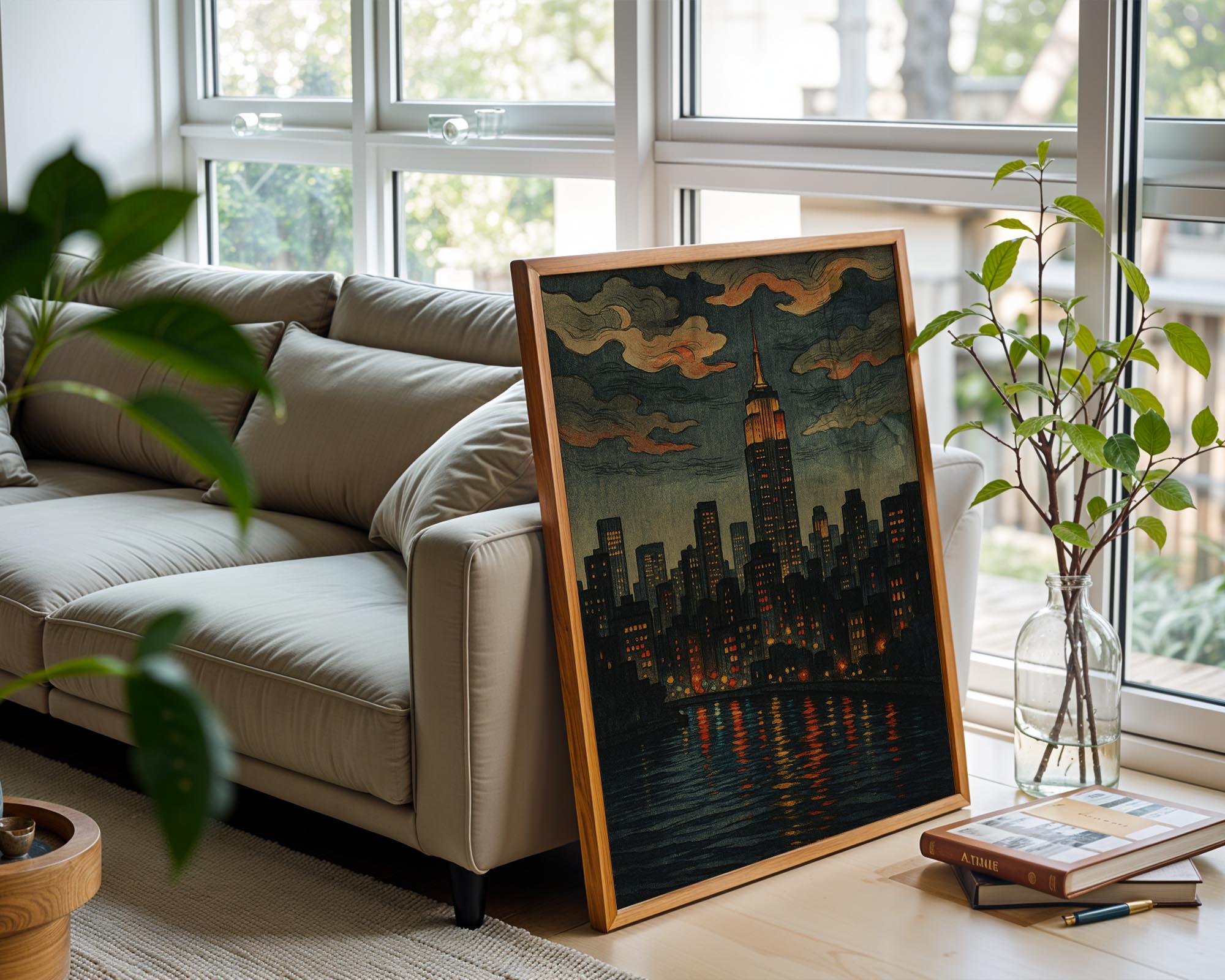 Rendered in deep tones of navy, copper, and charcoal, this print brings the romantic mystery of a night in New York straight to your wall. The soft shimmer of windows in countless skyscrapers, the cloudy sky painted in warm swirls, and the shimmering waterline below-it's Gotham gone golden hour.