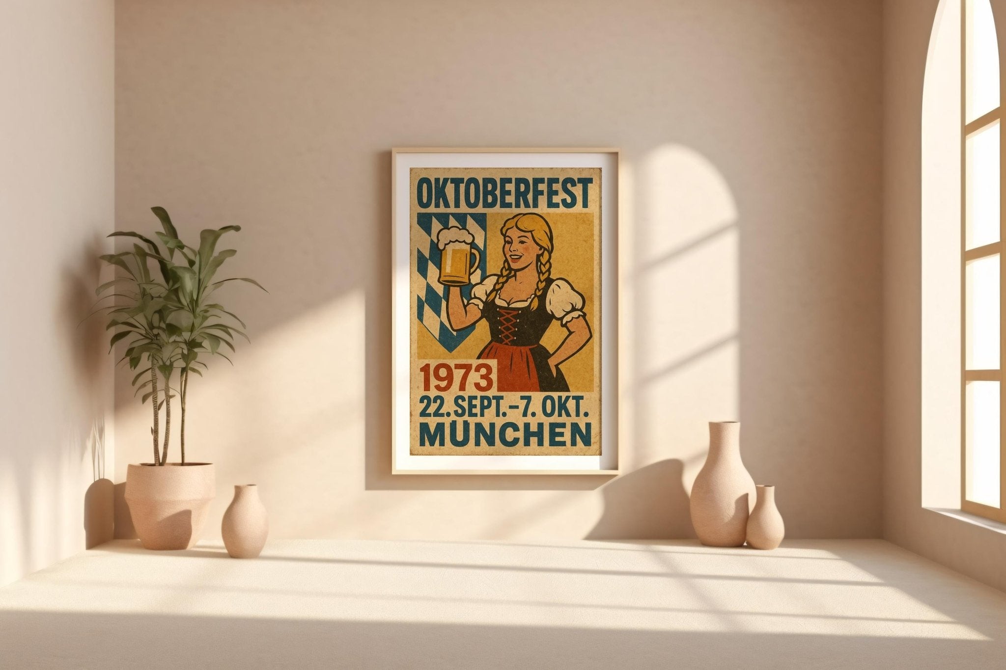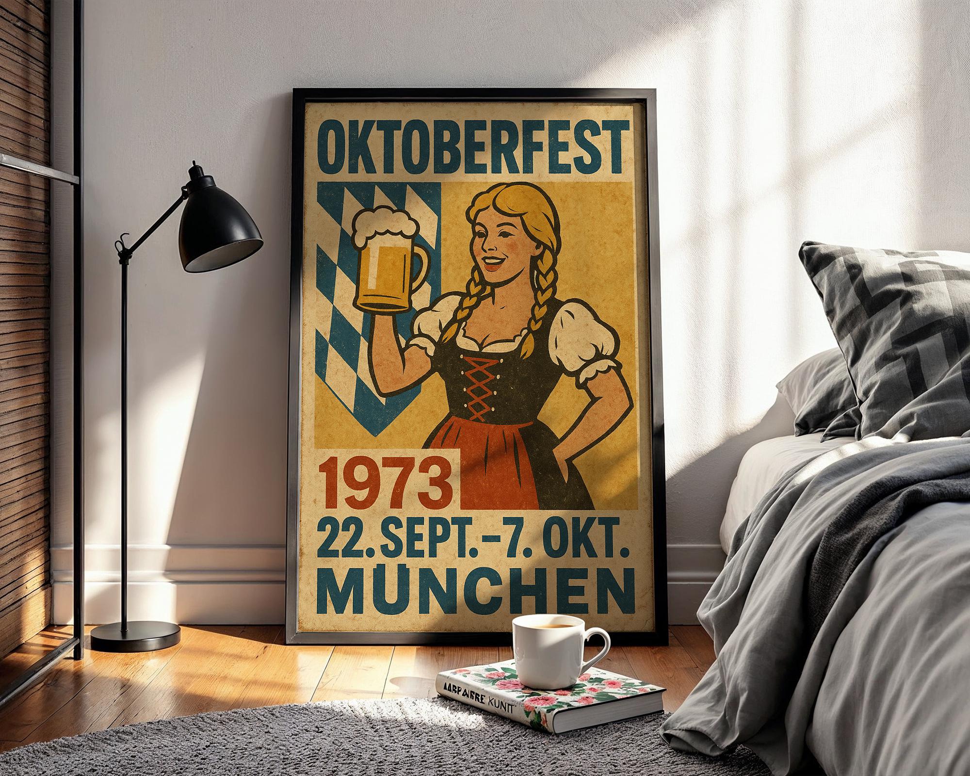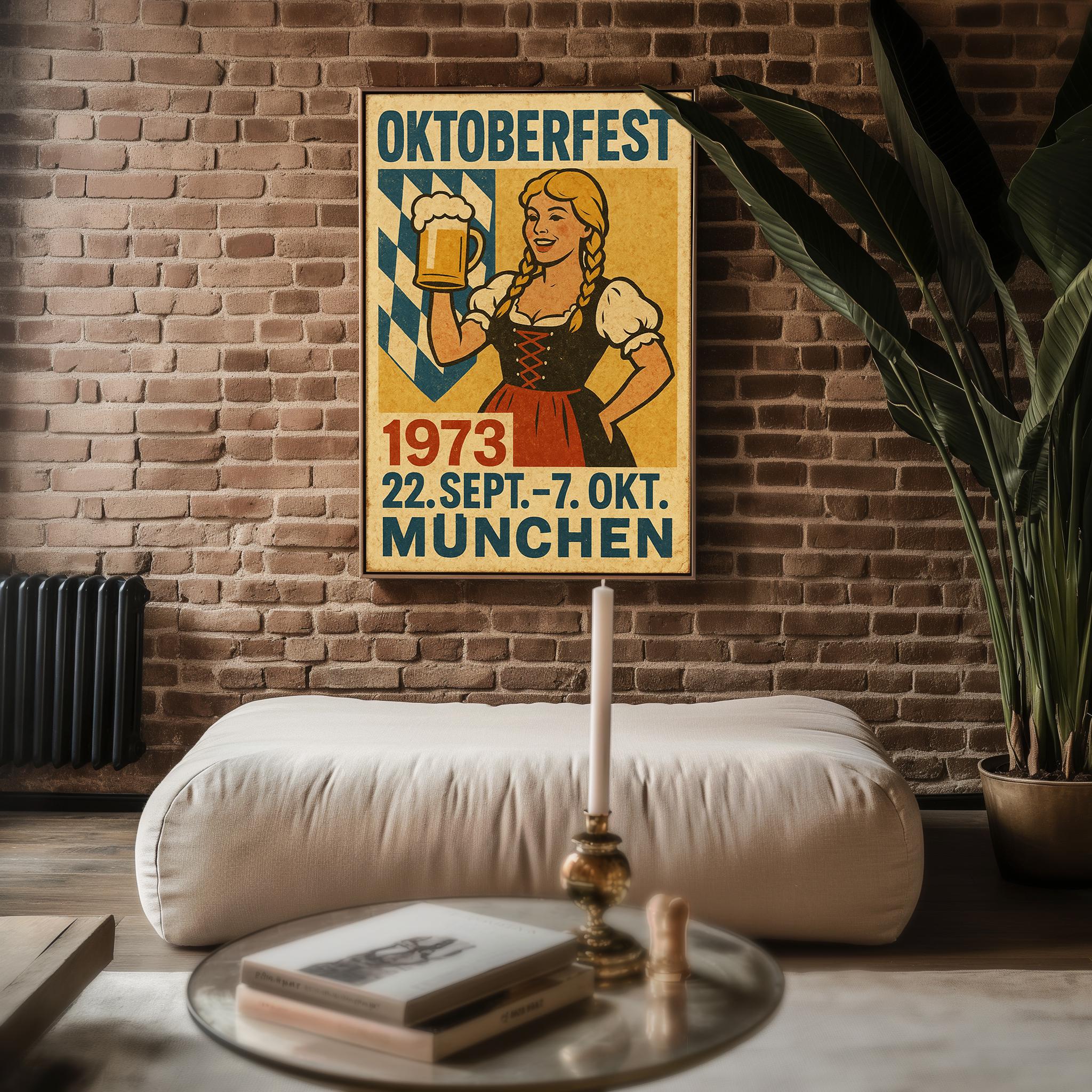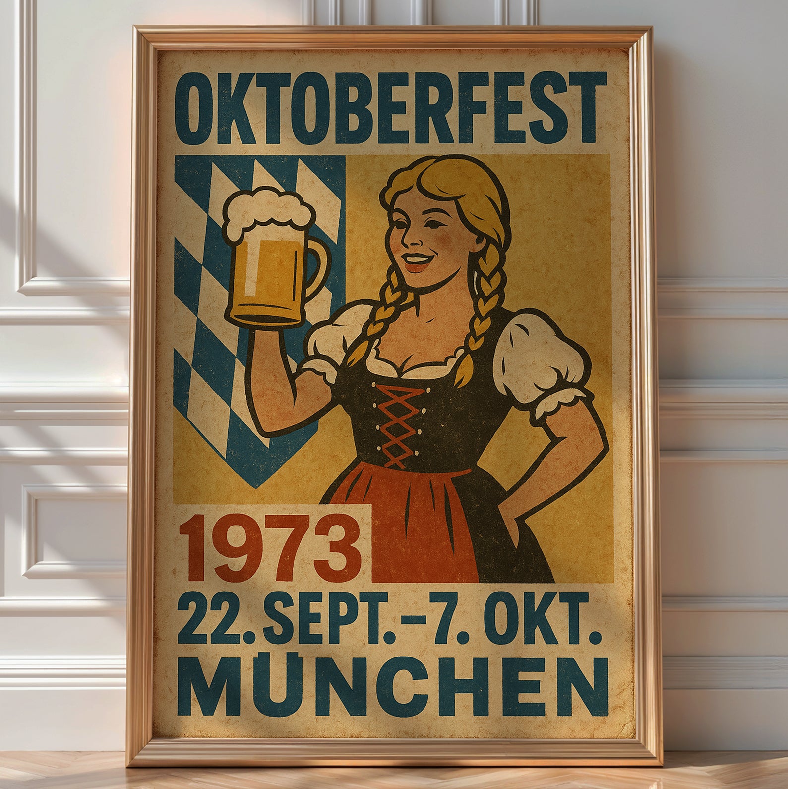 The palette is pure vintage goodness-mustard yellow, stein-foam beige, Oktoberfest blue, and worn red. The 1973 date adds that perfect flash of throwback for fans of 70s design, German culture, or collectible ephemera.