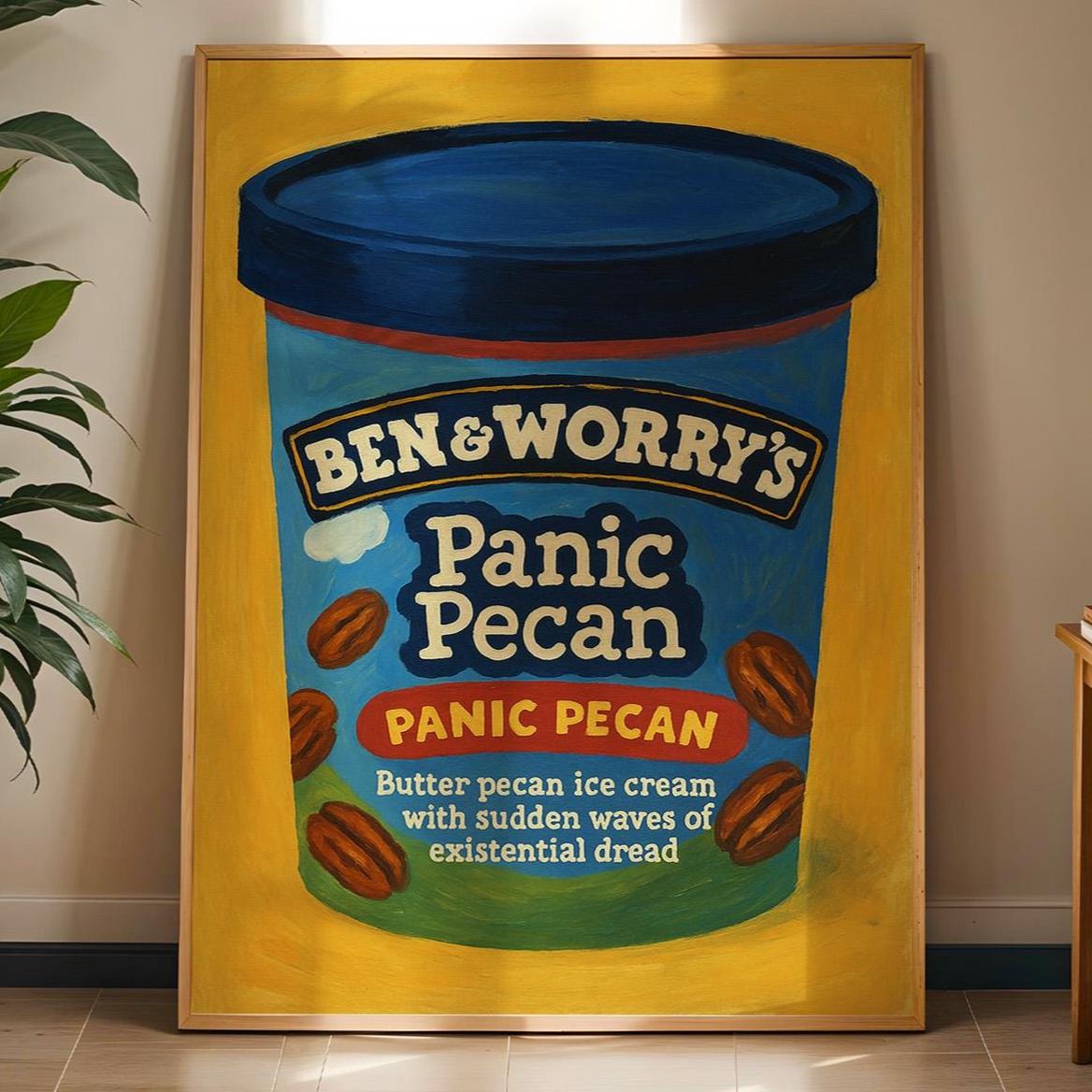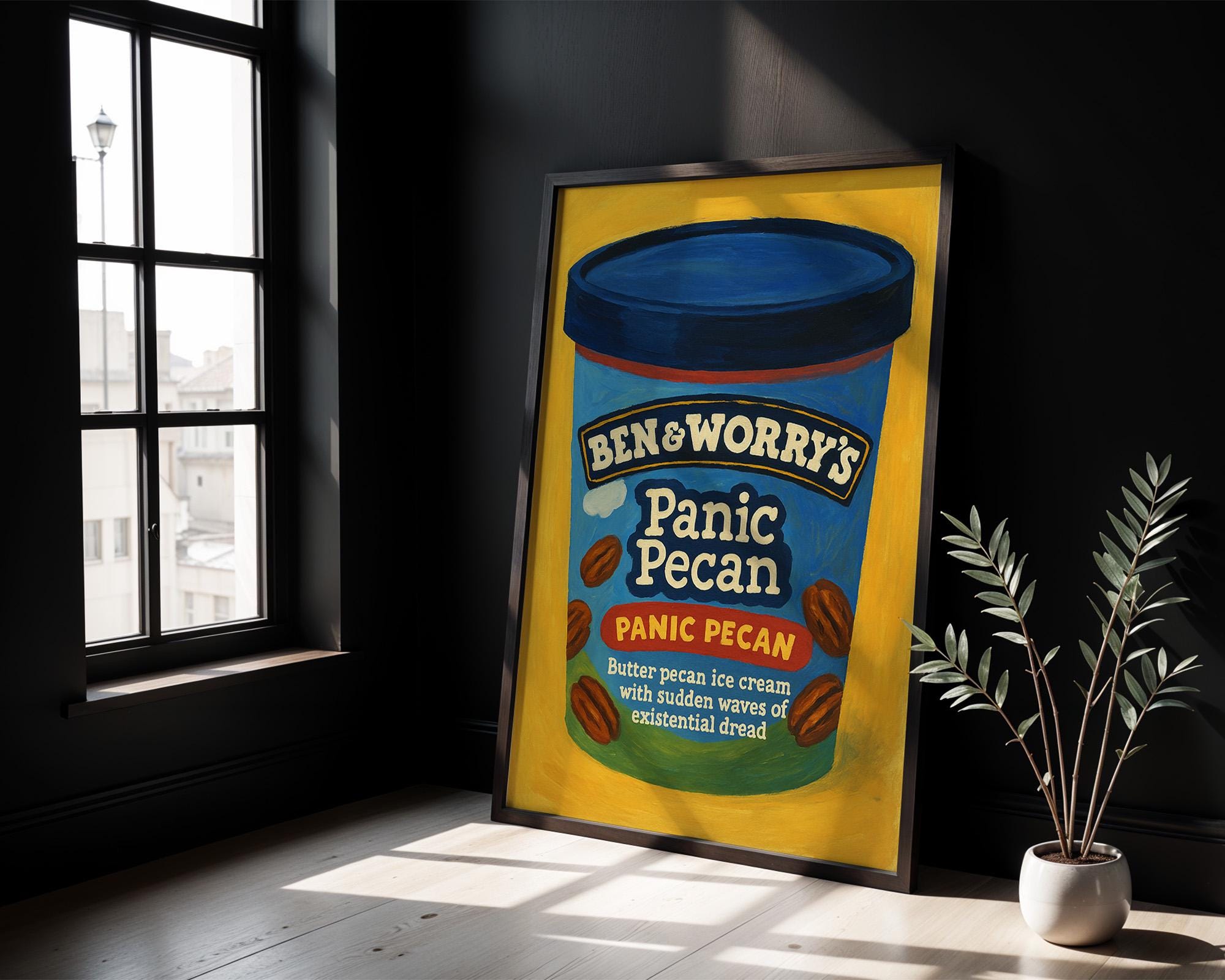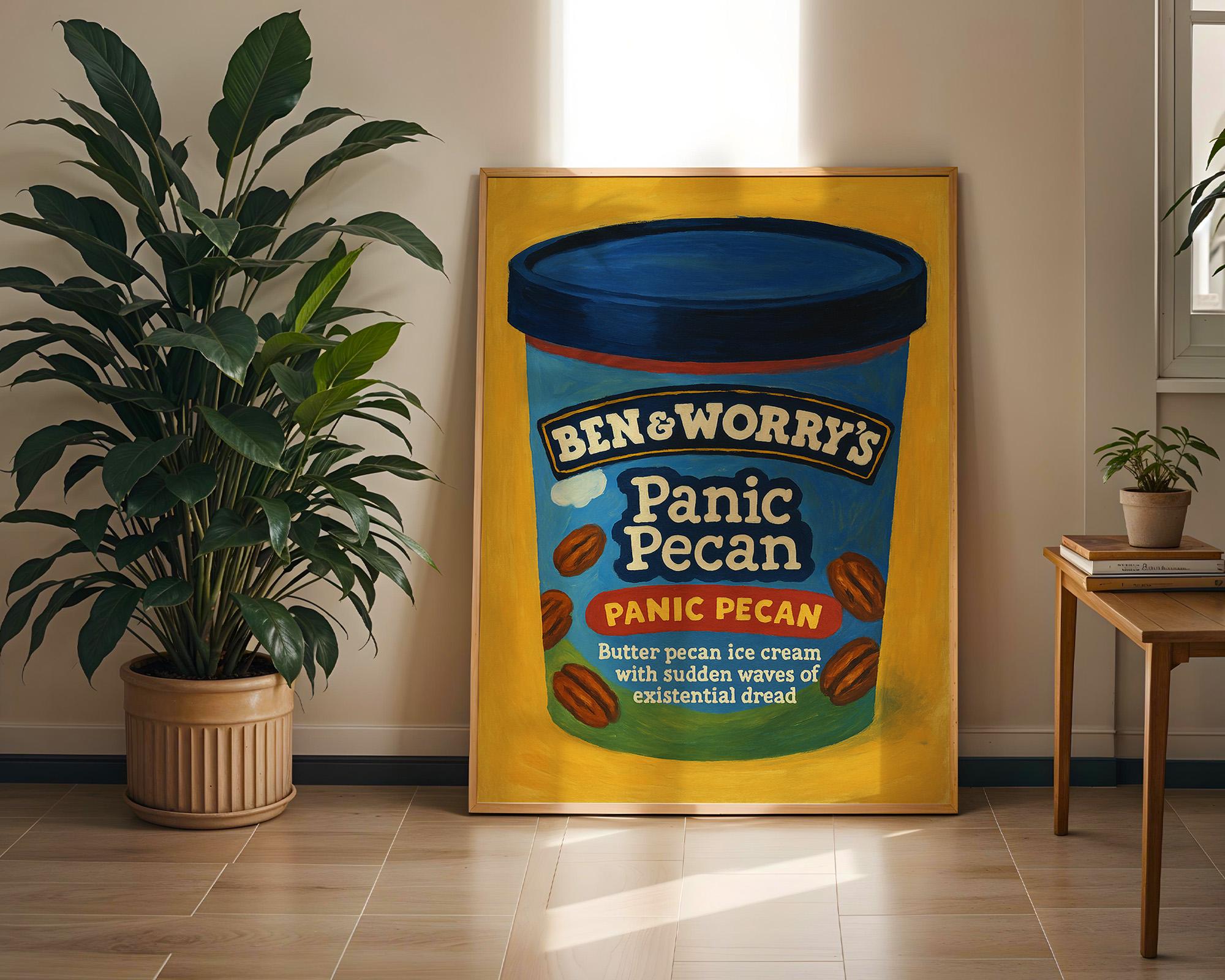 Panic Pecan is what happens when your nervous system meets nutty goodness. From the Ben & Worry's series, this hand-painted parody print is a deliciously chaotic tribute to the anxious brain in overdrive.