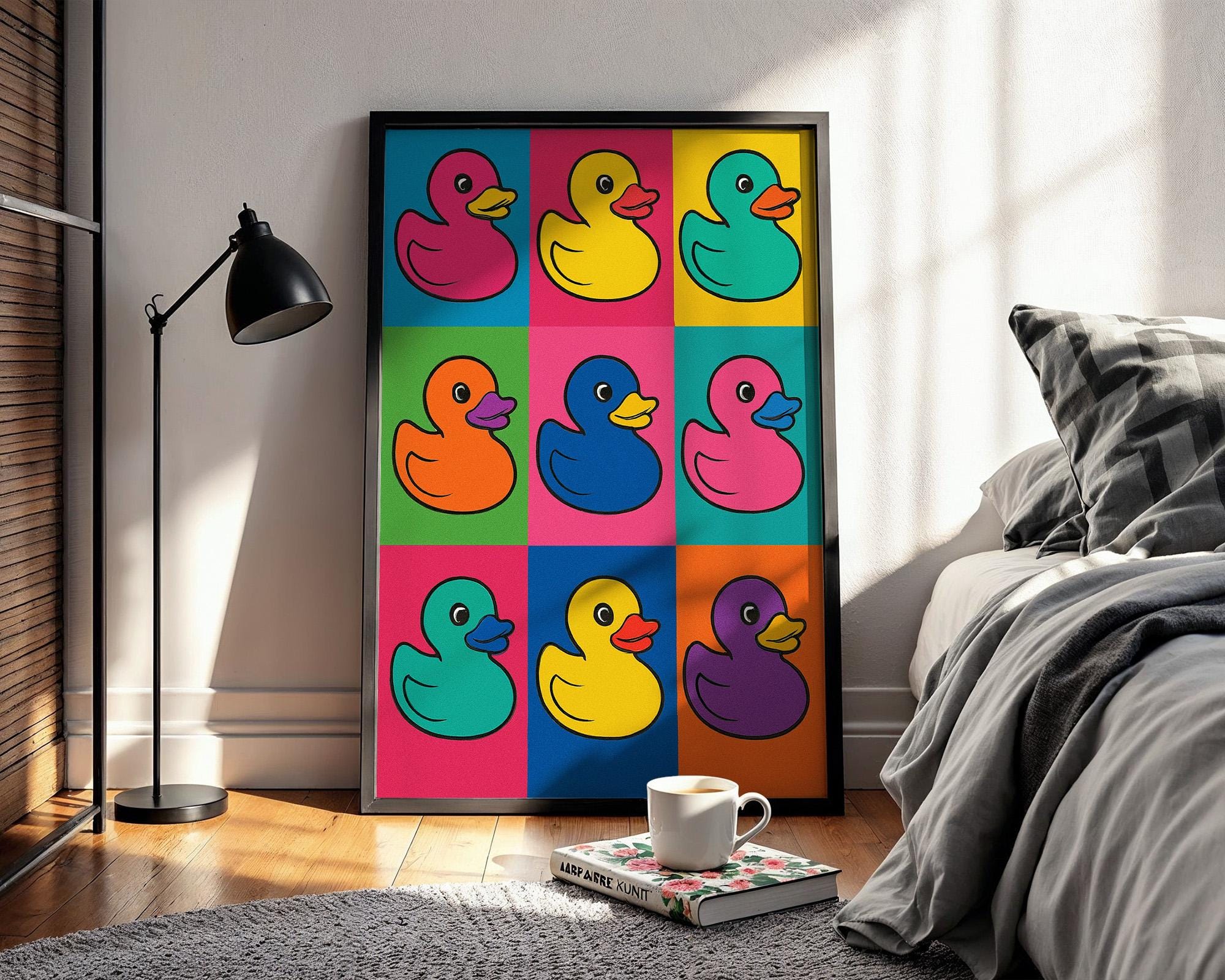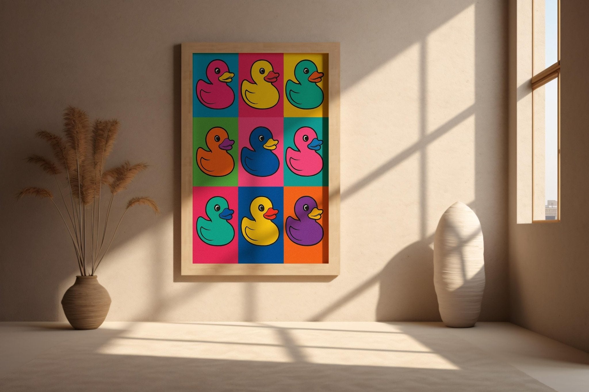 This cheeky pop art print reinvents the classic bath toy with a rainbow twist-nine ducks, nine colours, unlimited charm. Bright, bold, and delightfully absurd, it's perfect for kids' bathrooms, playrooms, or funky gallery walls.