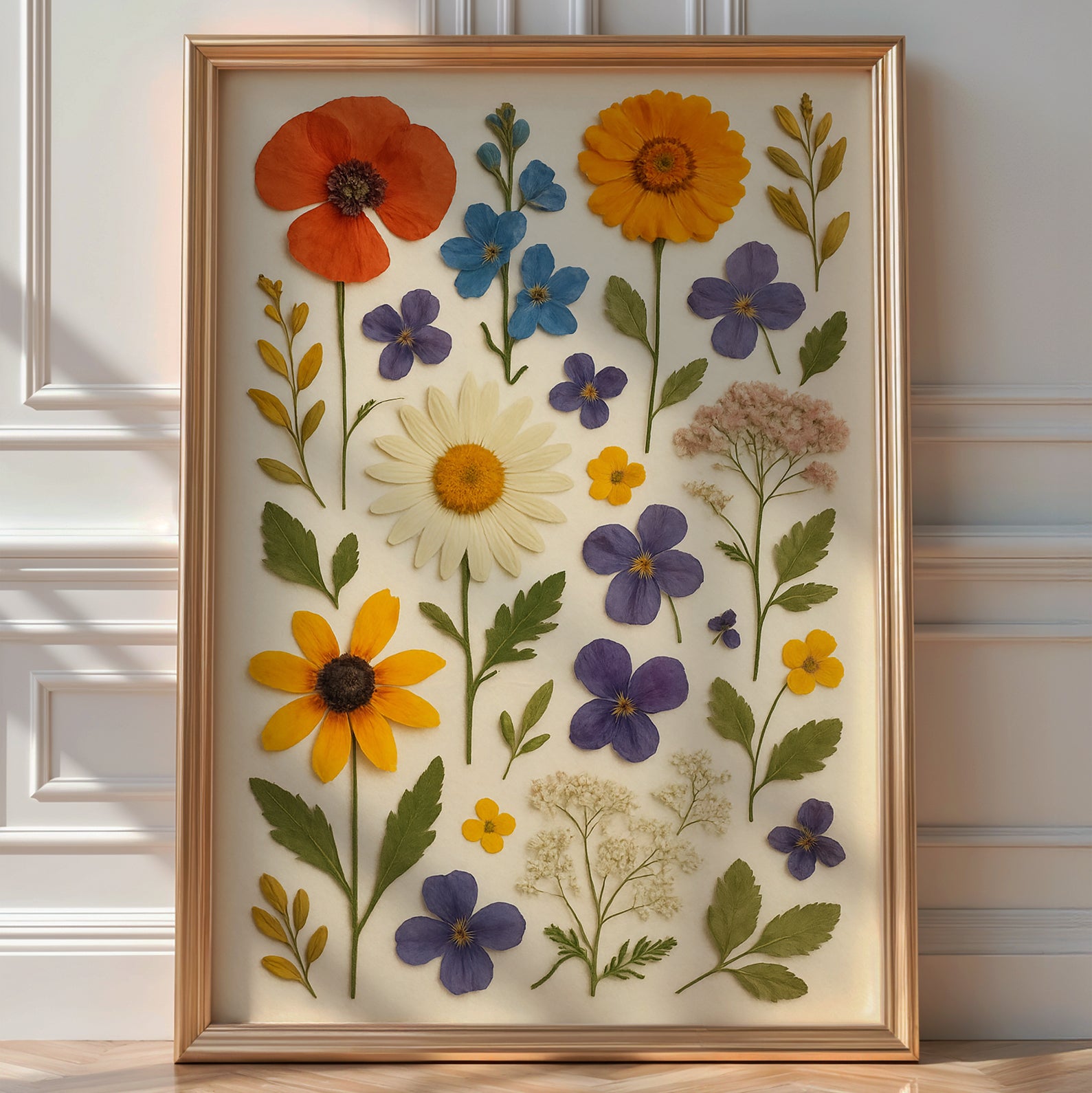 This faux pressed flower collage pairs beautifully with natural wood frames or minimalist white borders, allowing the vibrant colors to take center stage. Ideal for creating a focal point in a gallery wall or as a standalone piece that draws the eye.