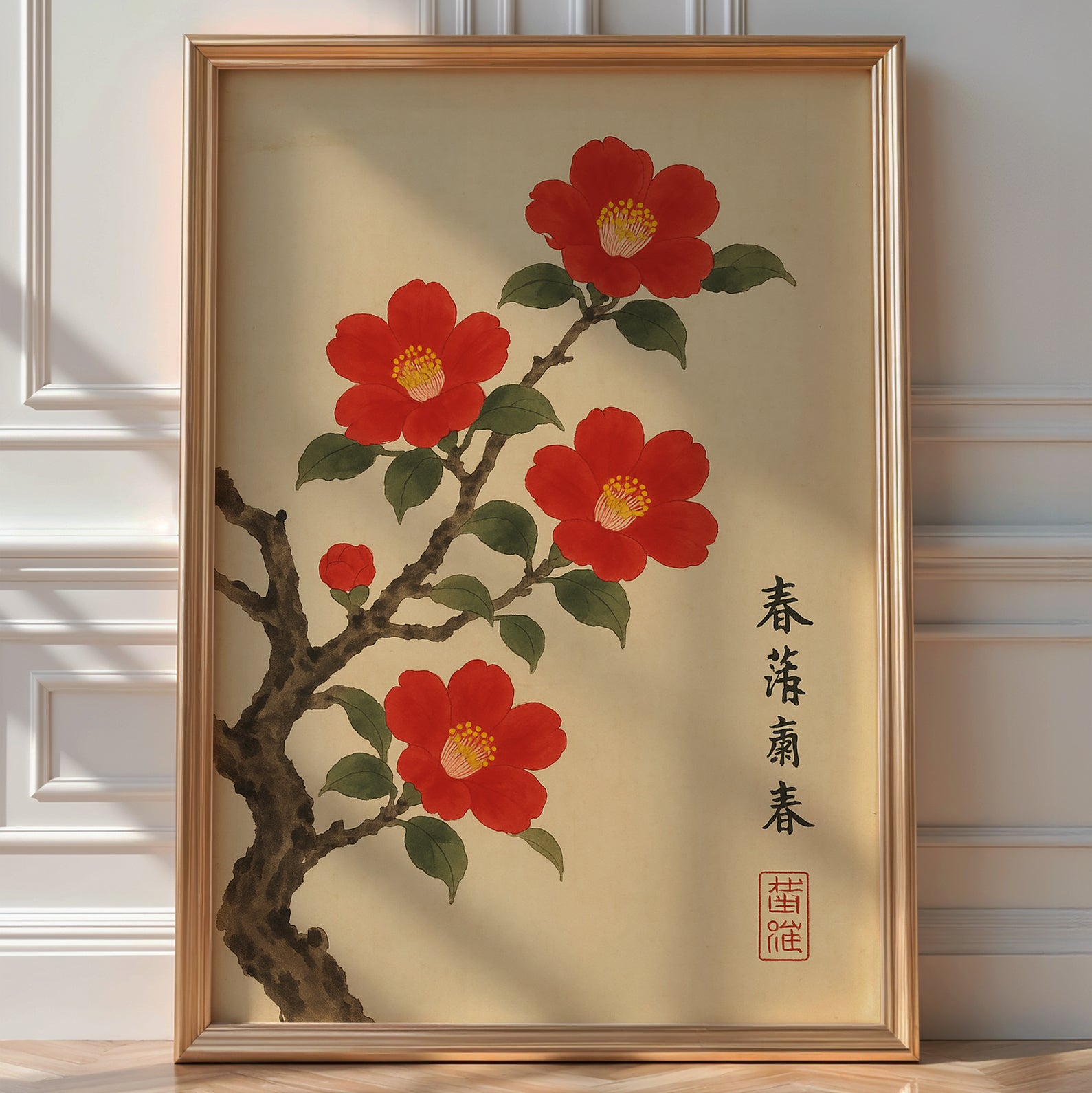 Inspired by Japanese and Chinese ink wash styles, the composition features five red camellia blossoms-each captured in varying stages of bloom-along the curve of a dark, weathered branch. The warm beige background evokes the feel of aged rice paper, while the vertical brushstroke calligraphy and seal stamp add authentic cultural character.