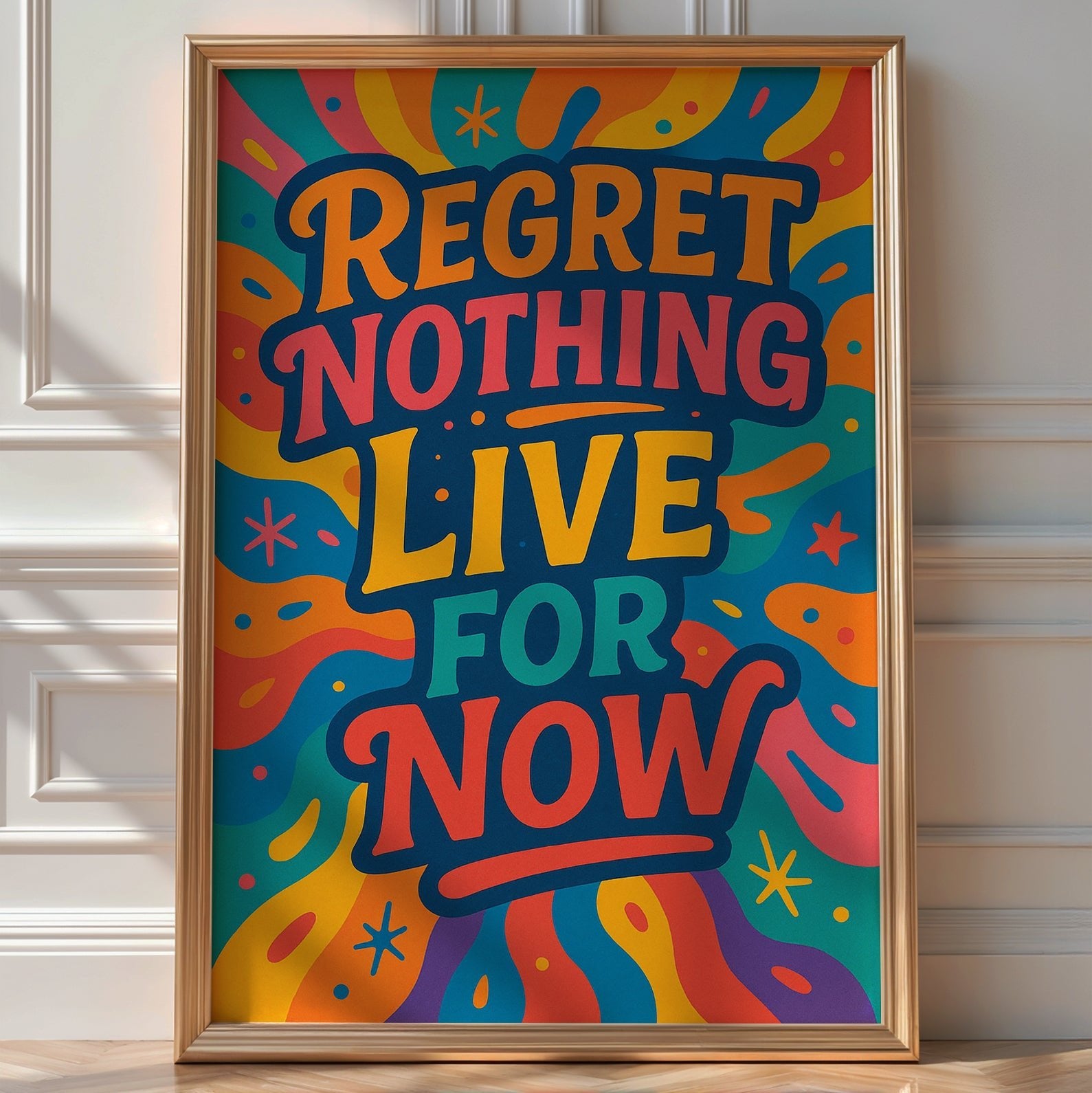 This trippy, eye-catching poster combines a surreal collage of faces, flames, symbols, and textures with bold typography that demands presence. The "Regret Nothing / Live For Now" message is woven into the visual chaos, making it part mantra, part artwork, all momentum. With vintage paper tones and a riot of vibrant color, it's the kind of print that takes over a space-and owns it. Ships free and printed on 260gsm archival-quality paper for long-lasting visual punch.