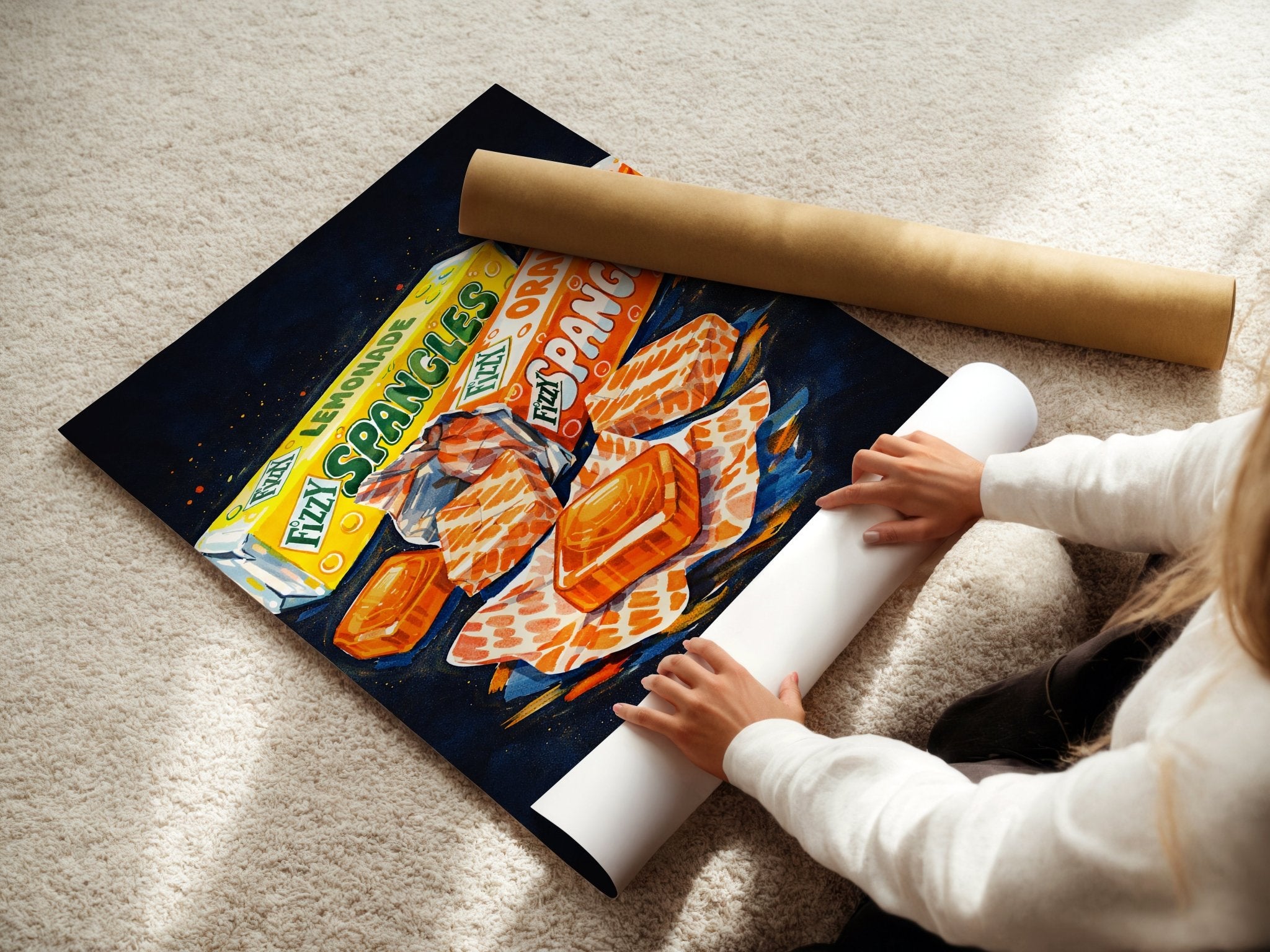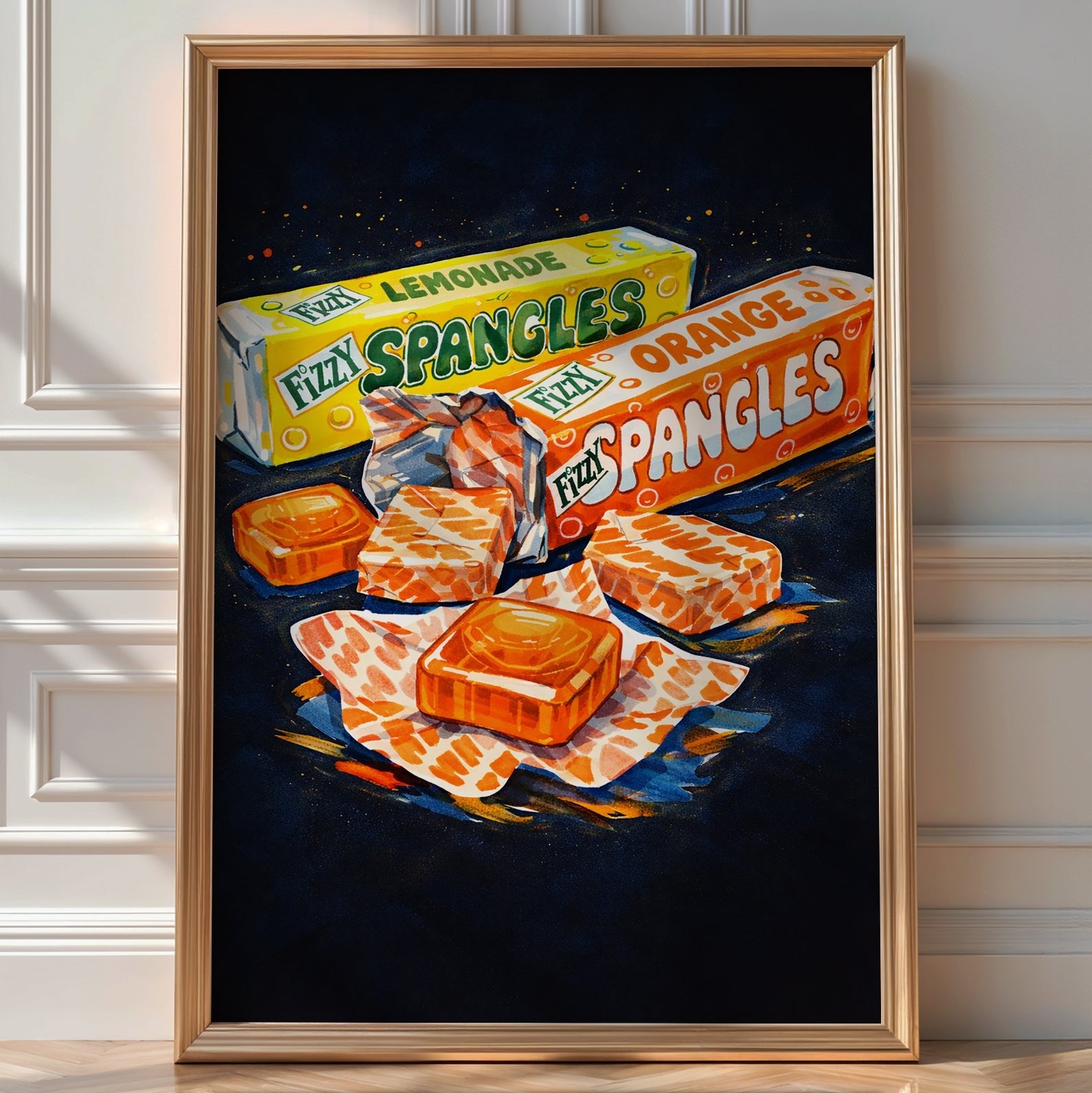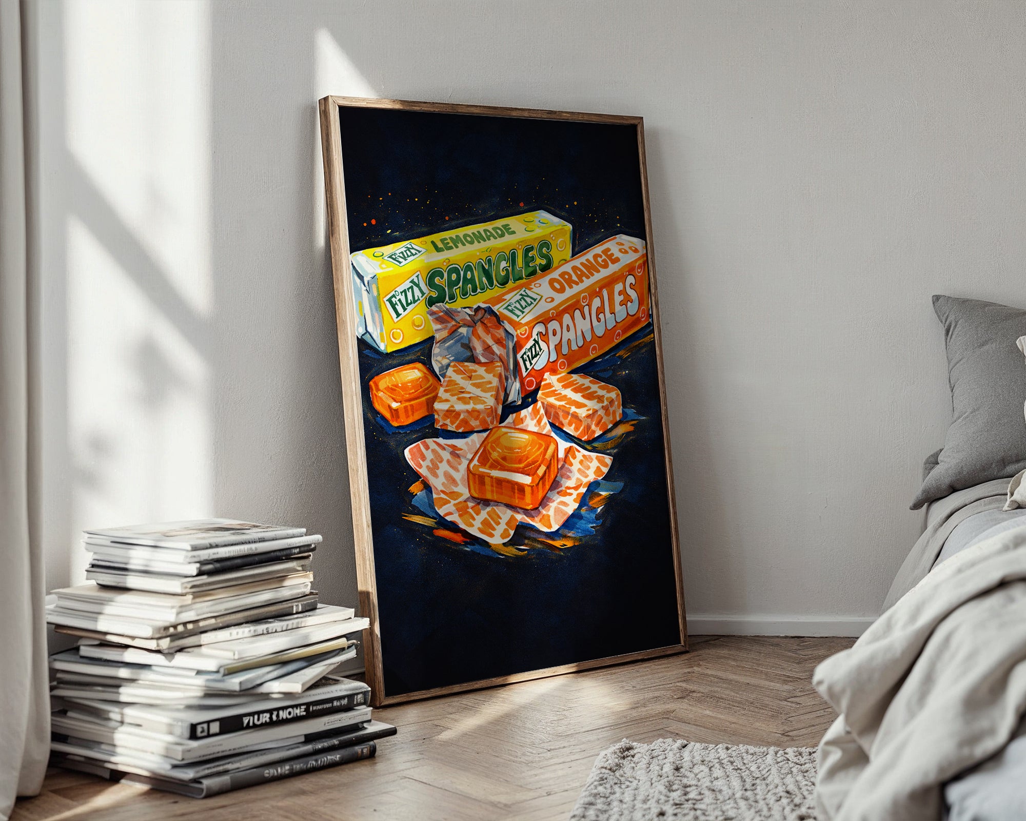 Bold, bright, and bubbling with nostalgia. This Retro Spangles Poster throws it back to fizzy orange and lemonade favourites from the British sweet shop heyday. With vibrant colours and vintage packaging, it’s a sugar rush for your wall.