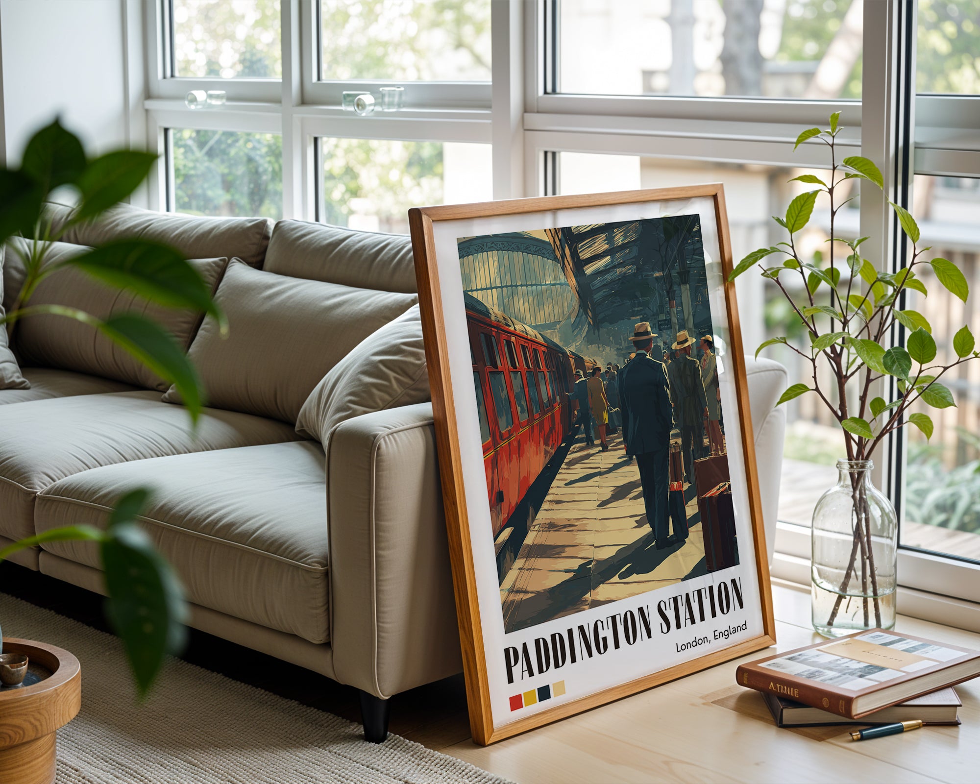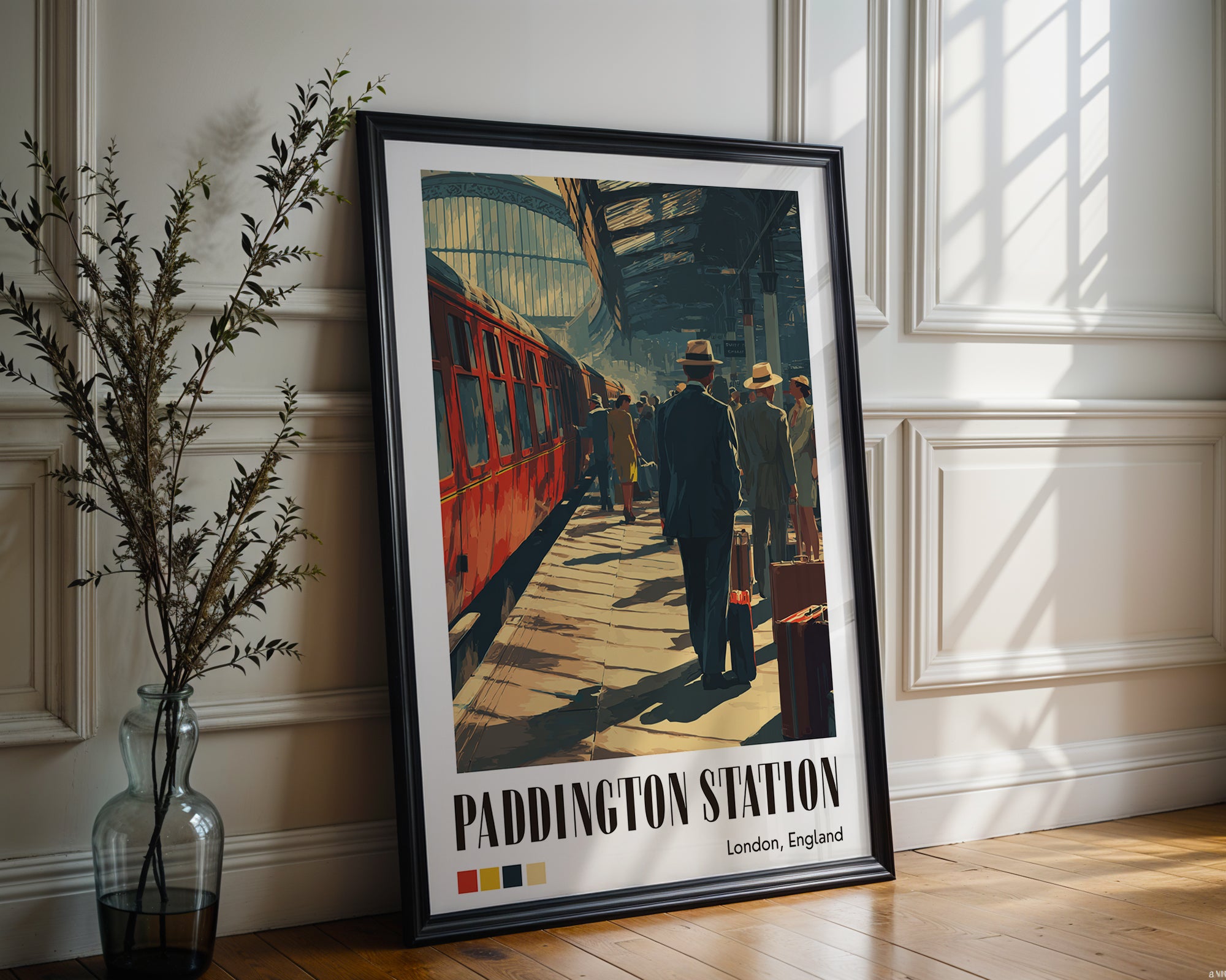 Step into the golden age of travel with this stunning vintage-style art print of Paddington Station, London’s most iconic rail hub. Bathed in warm light, the scene captures the romance of departure and the quiet anticipation of arrival—a cinematic moment frozen in time. From the shadowed glass canopy to the bold red train carriages and well-dressed travelers, every detail evokes an era when travel meant something.