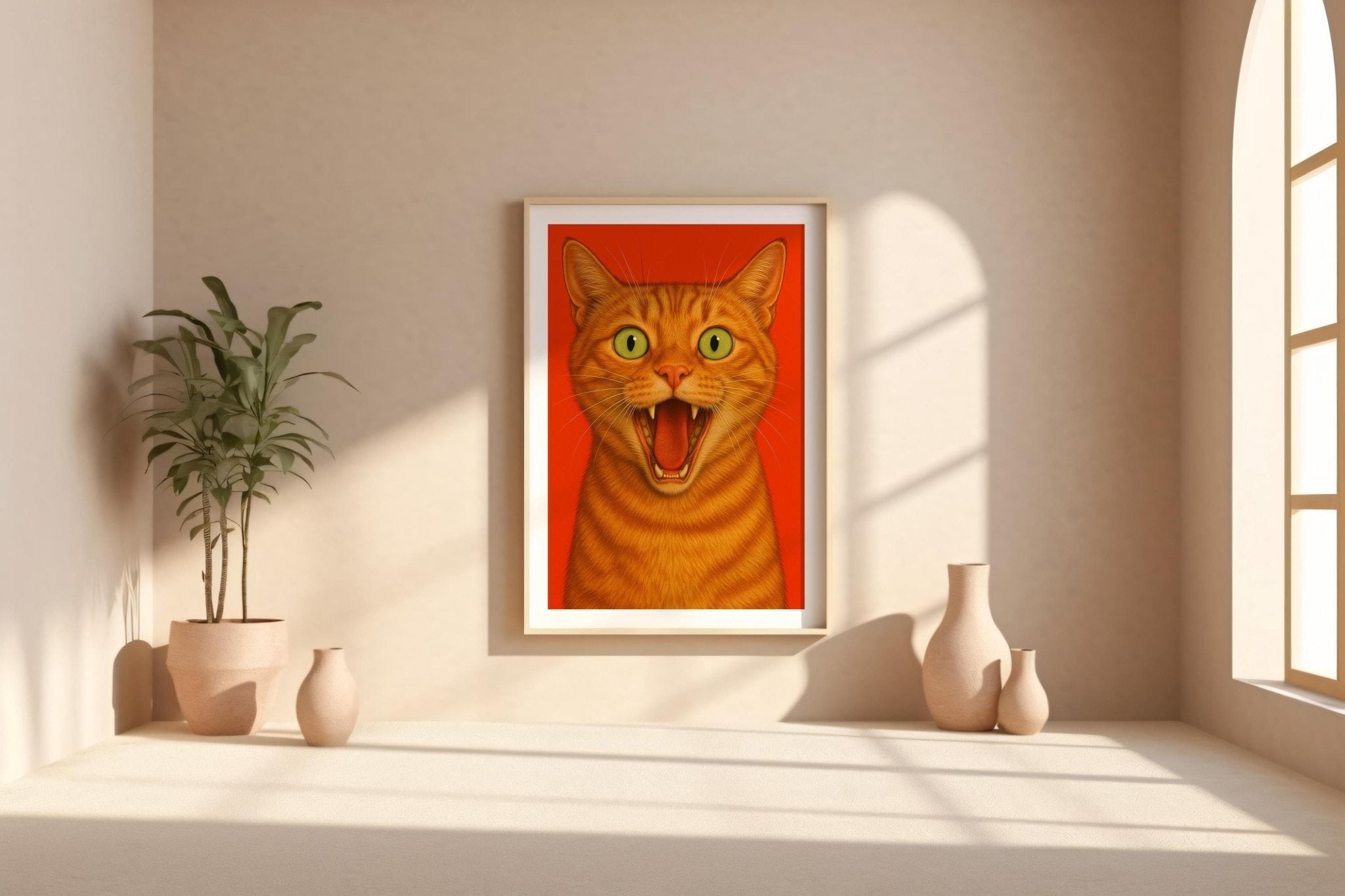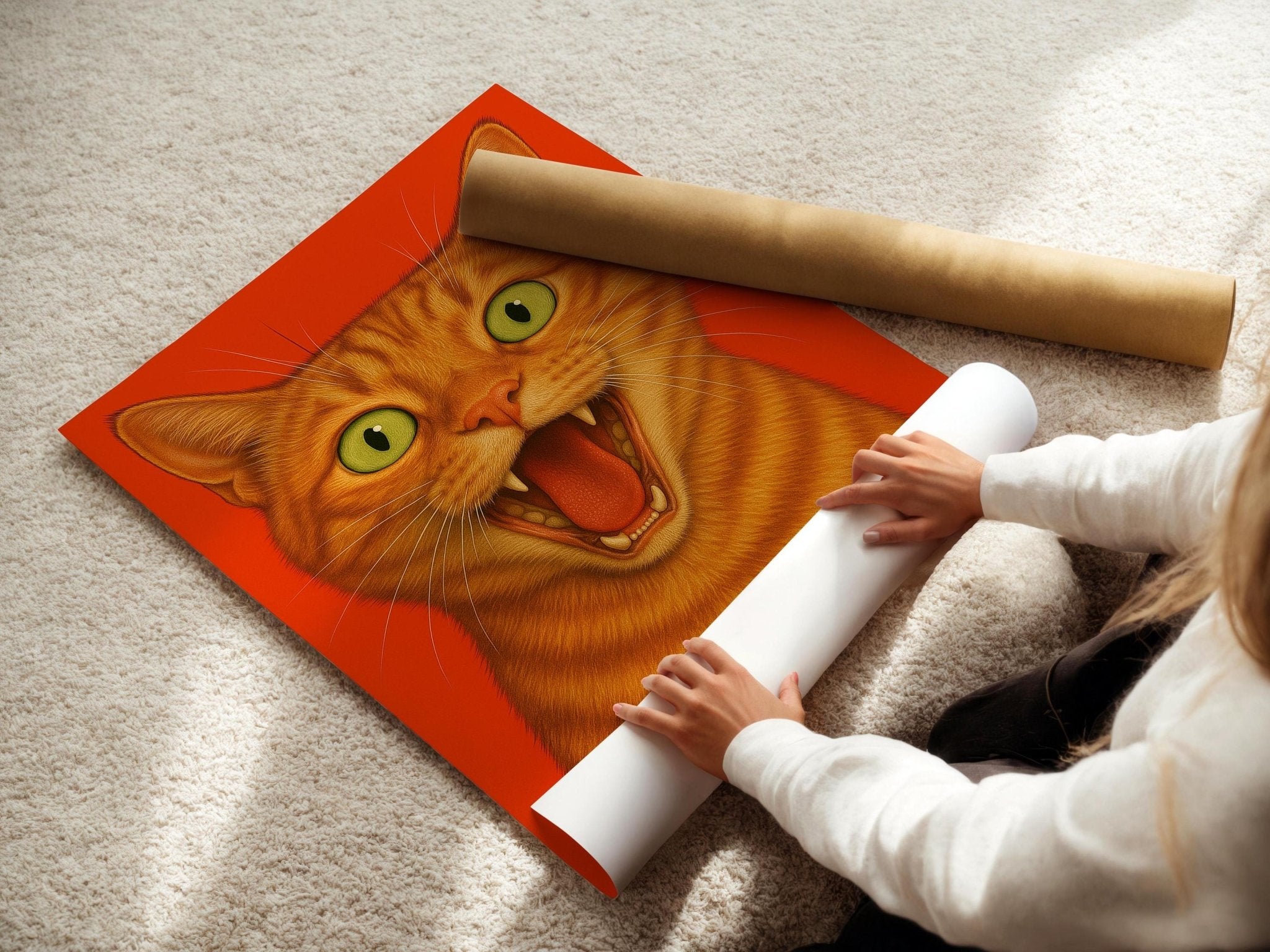 This piece is loud-in color, expression, and attitude. It's a full-on feline freakout that brings instant humor and visual punch to any space. Whether you're a cat owner, cat admirer, or cat chaos enabler, this print speaks your language. It says: "Feed me." "Pet me." "Don't look at me." All at once.