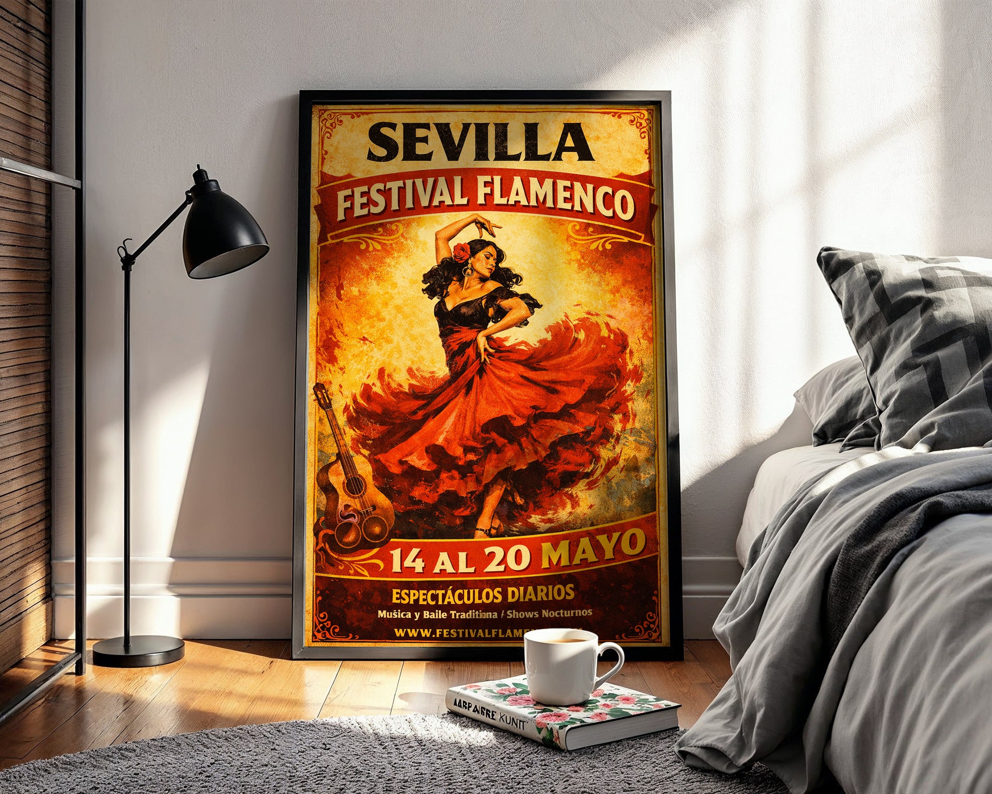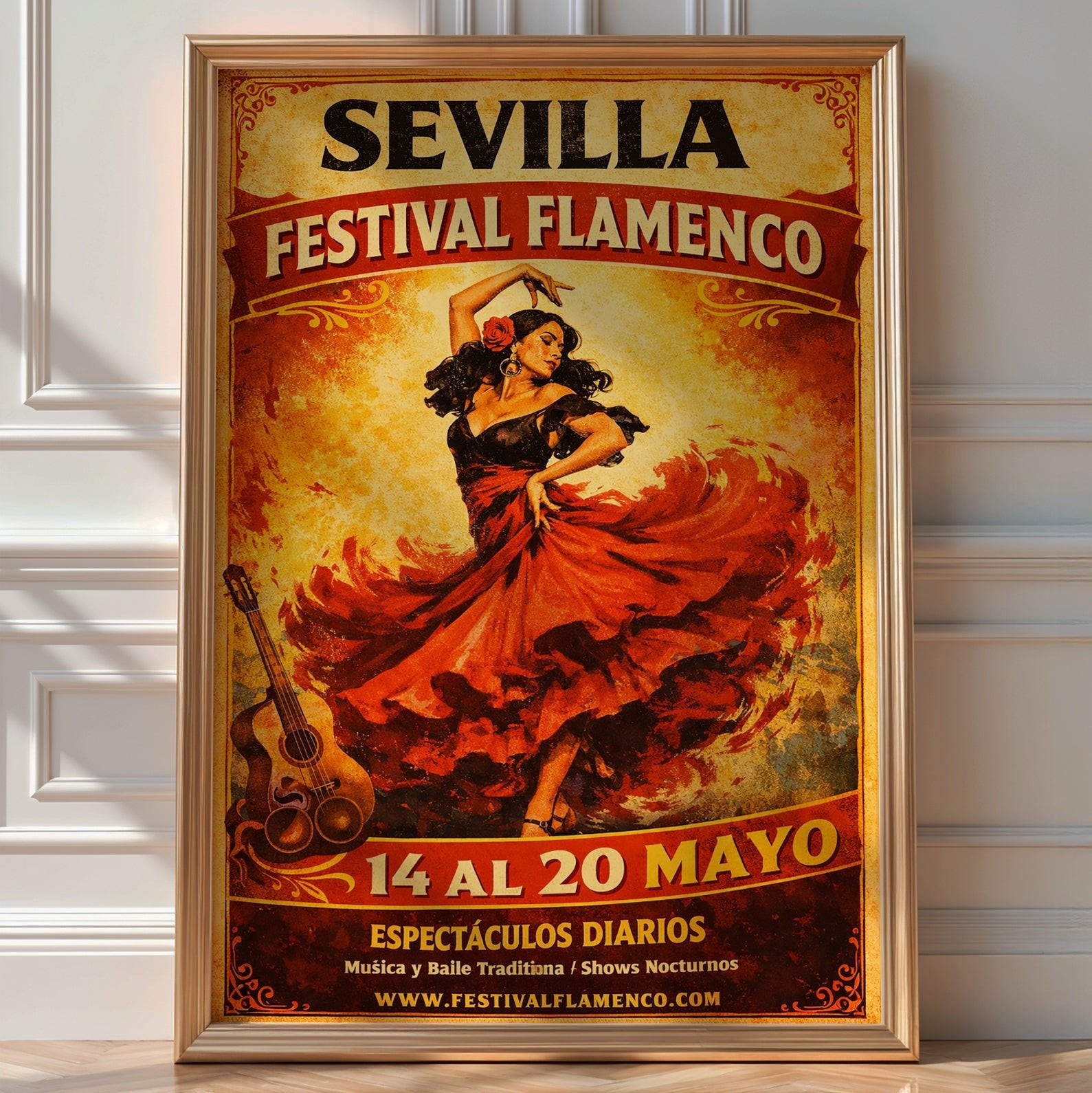 Dynamic, fiery, and captivating — this Sevilla Flamenco Festival Poster celebrates the passion of Spanish dance. A flamenco dancer bursts forward in a swirl of red, flanked by guitar imagery and traditional festival typography.