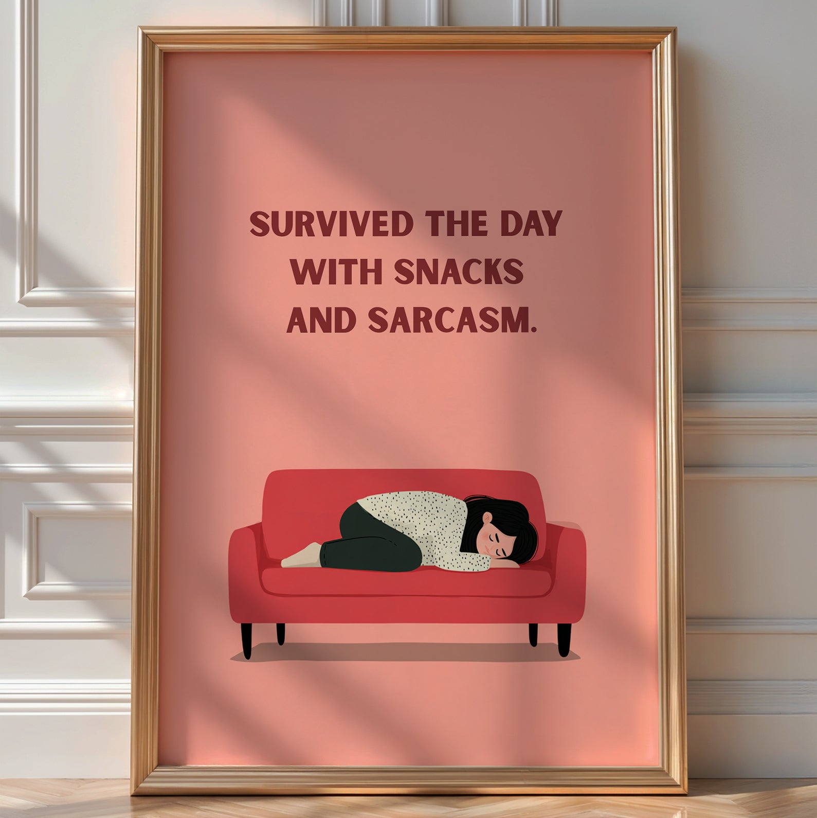Sometimes surviving the day means snacks—and a healthy dose of sarcasm. This cozy, relatable poster features a laid-back figure curled on a sofa under the cheeky phrase, “Survived the day with snacks and sarcasm.” It’s perfect for bedrooms, lounges, or self-care nooks where humor and comfort collide.