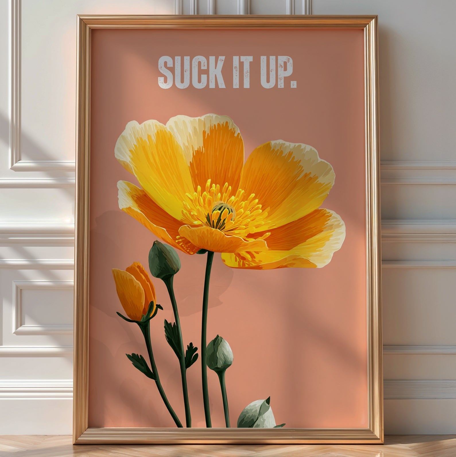 Harsh words, bold design. Suck it Up, Buttercup? serves a double dose of charm: comforting British warmth wrapped in punchy yellow type. This is everyday affection, rebranded for your wall—equal parts pep talk and straight talking.