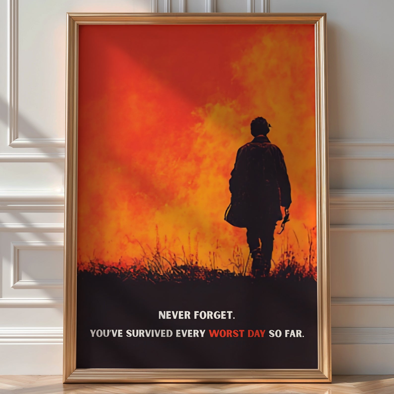 A lone figure walks away from roaring flames, backed by the weighty message: “Never forget. You’ve survived every worst day so far.” It’s emotional, cinematic art that speaks to resilience and strength. Perfect for offices, recovery spaces, or rooms needing a touch of tough-love motivation.