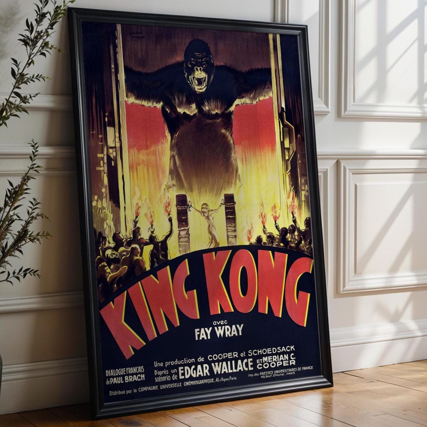 Vintage Movie Poster Print – King Kong French Cinema Reprint – 1930s Giant Gorilla & Fire Scene with Classic Film Artwork