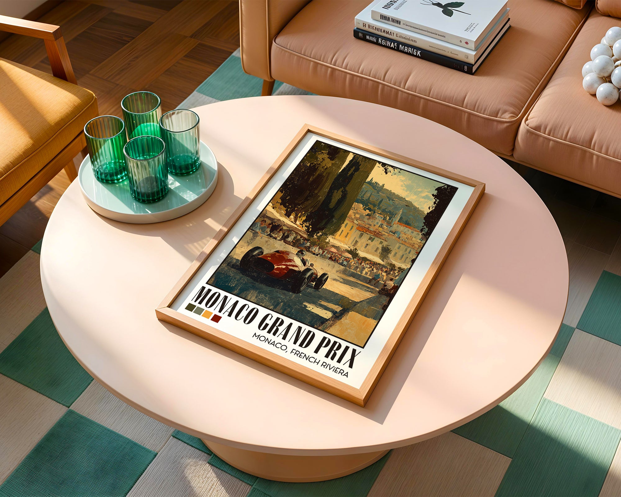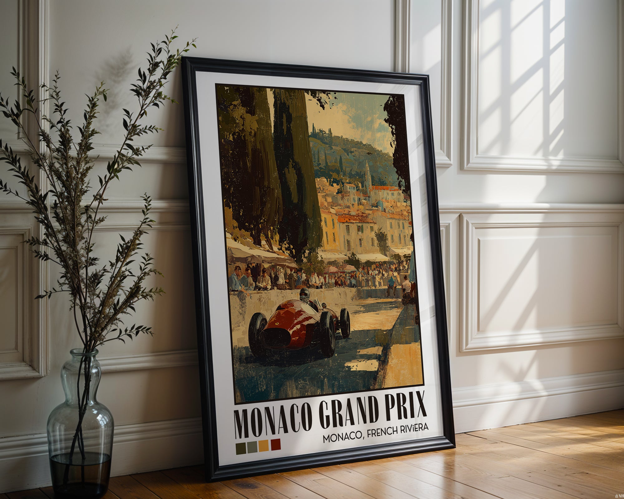 Feel the roar of the engine and the glamour of the French Riviera with this striking Monaco Grand Prix art print. Inspired by vintage Formula 1 posters from the golden age of racing, this piece places you trackside—where speed, sun, and style collide. The bold red race car careens past palm-lined boulevards and pastel villas, with a painted texture that feels sun-bleached and sun-drenched all at once.