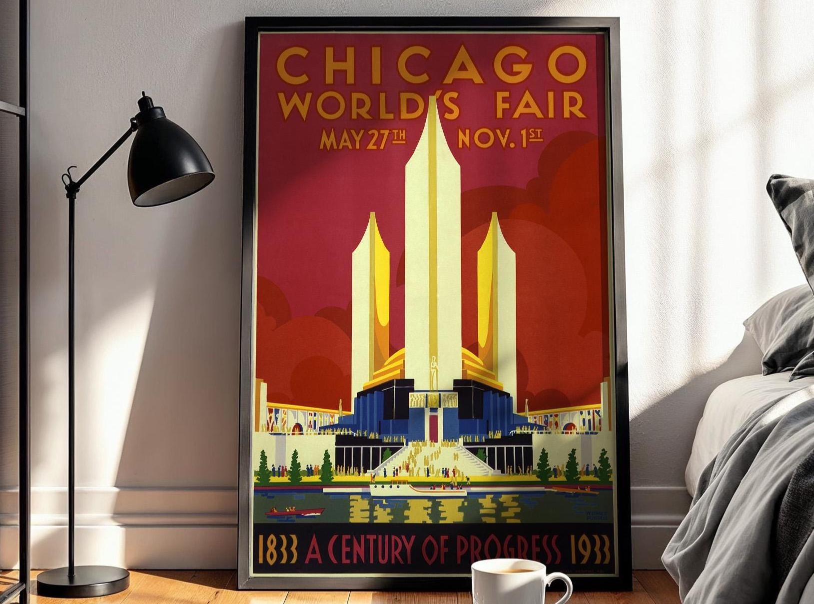 Vintage World’s Fair Poster Print – Chicago 1933 Century of Progress Reprint – Art Deco Skyline and Expo Pavilion Artwork - Just Great Posters