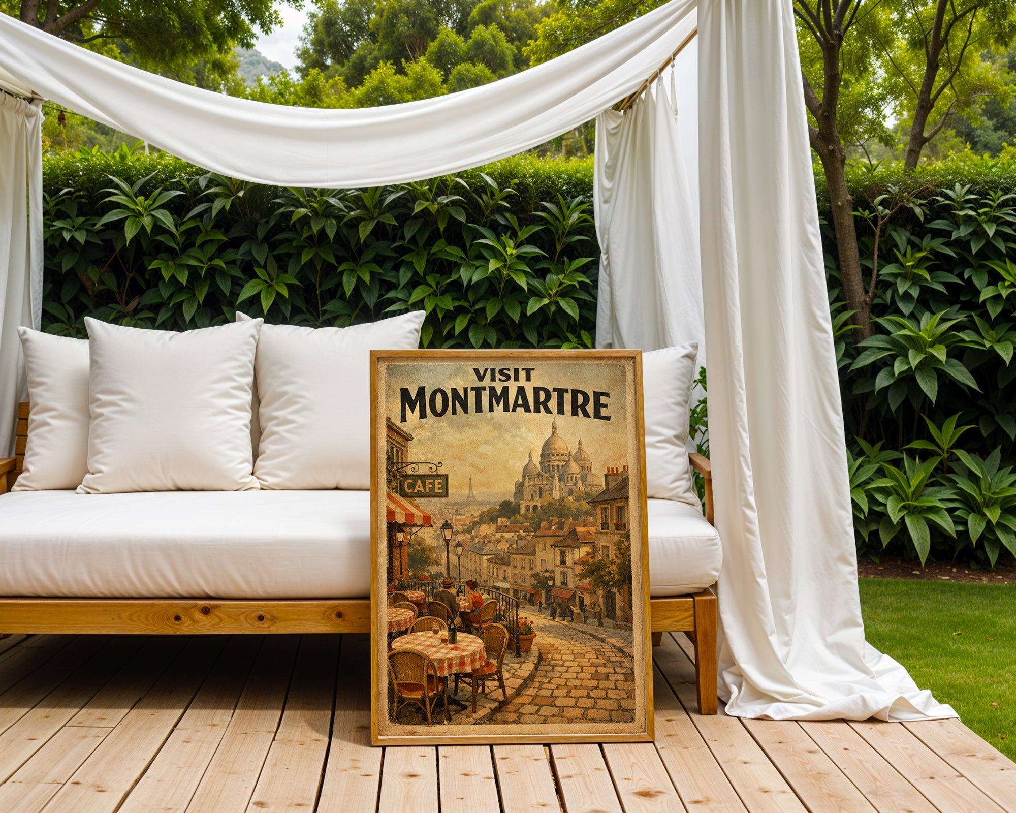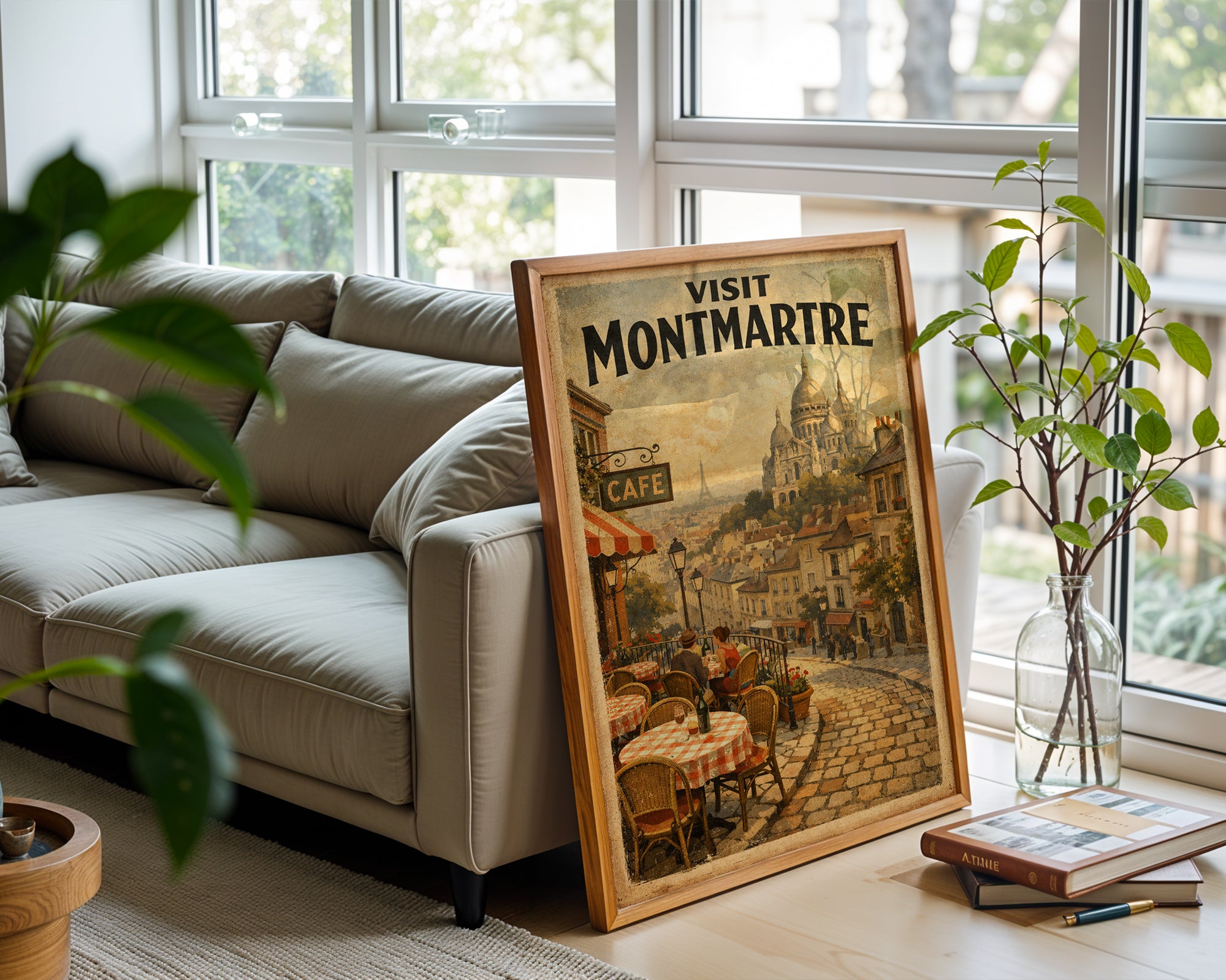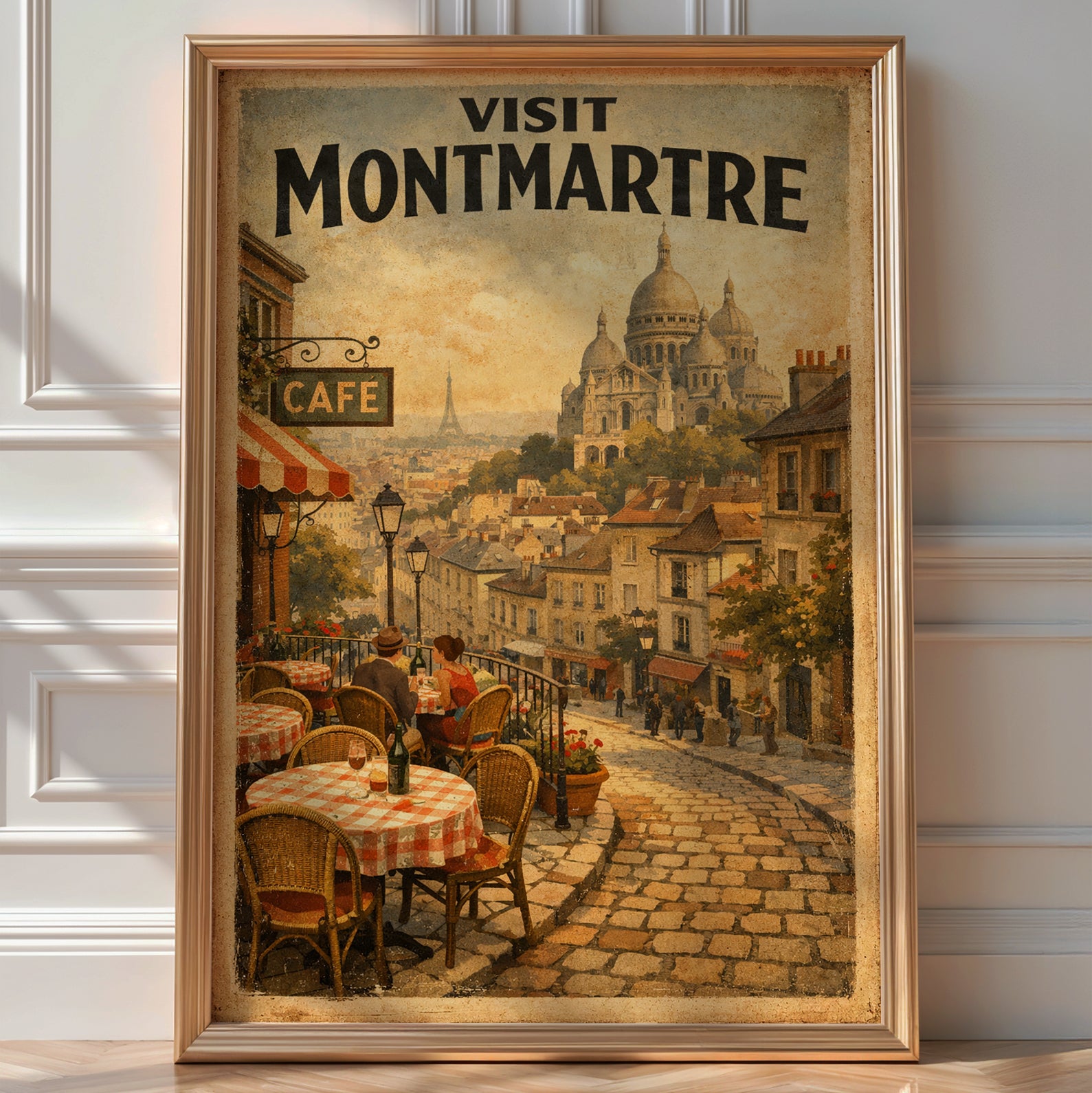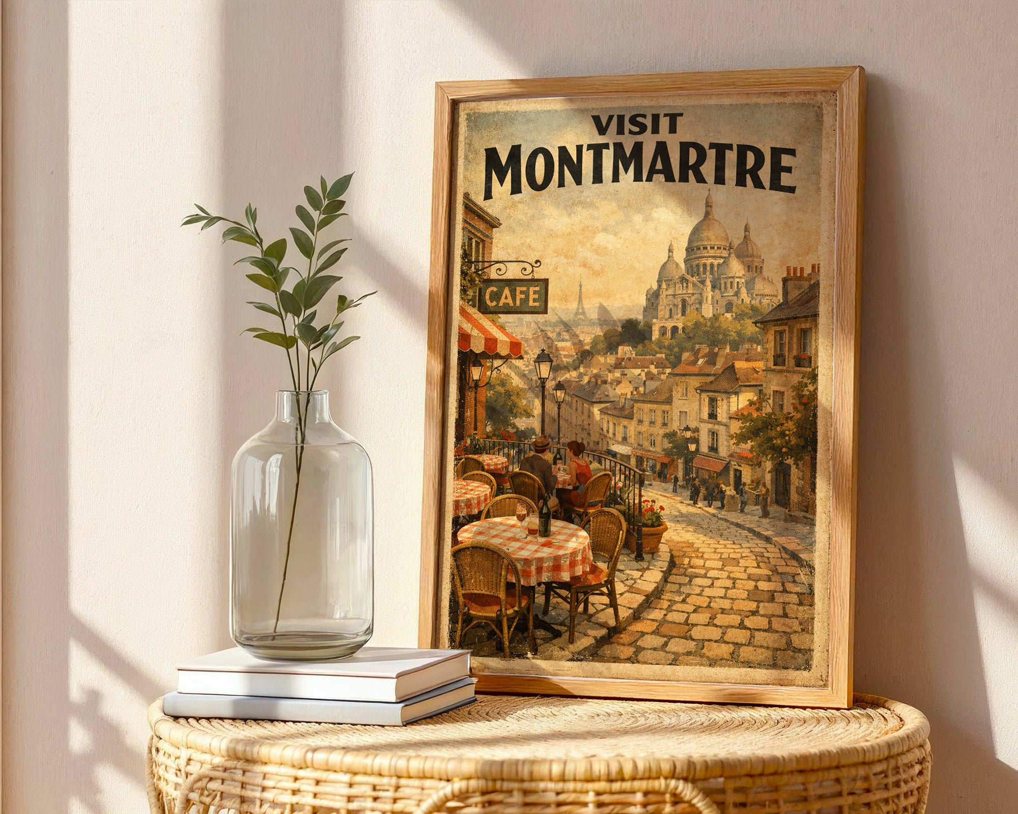 Romantic, relaxed, and effortlessly charming. This Visit Montmartre Poster captures café life on Paris’s most iconic hill, with cobblestone streets, terrace seating, and sweeping city views.