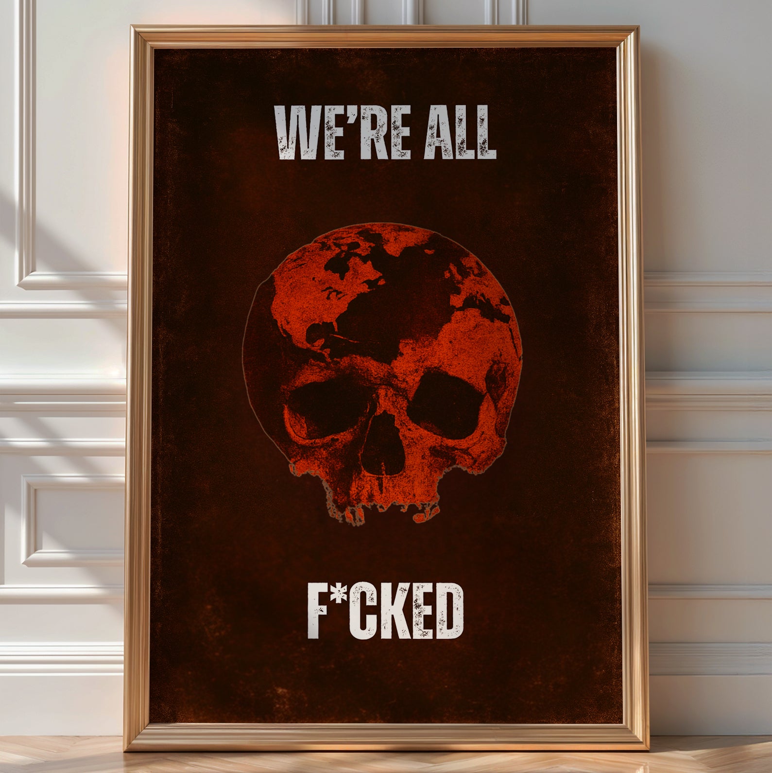 For those who like their wall art with a little bite, meet the We’re All Fcked* poster — a gritty, unapologetic design featuring a blood-red skull shaped like Earth. It’s raw, it’s rebellious, and it’s a statement piece for anyone who thrives on dark humor, punk energy, or end-of-the-world aesthetics. Perfect for bedrooms, studios, or that corner of your home that demands something bold and subversive. Printed on heavyweight 260gsm matte paper for sharp, museum-quality detail and lasting impact. And yes — shipping is free worldwide. Because if the world’s ending, at least your walls can look badass.