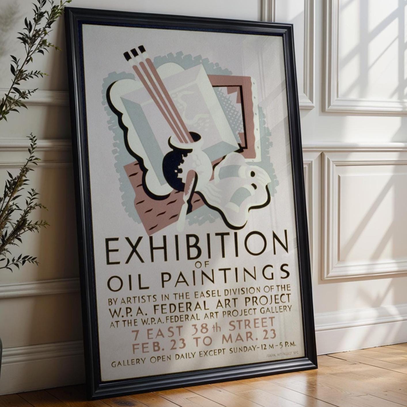 This 1930s Federal Art Project print advertised a public oil painting exhibit. Clean lines and creative layout make it a stylish piece of poster history. Printed with care. Ships free.