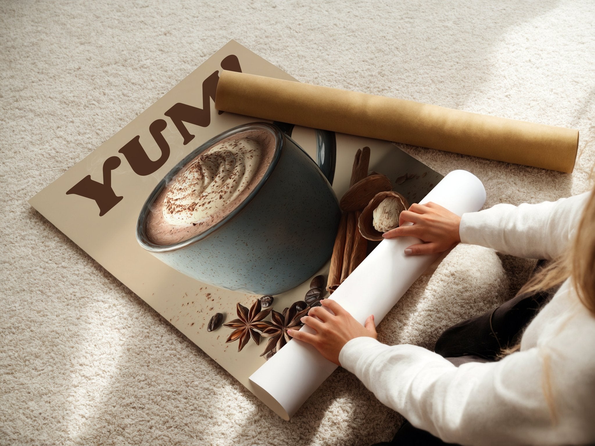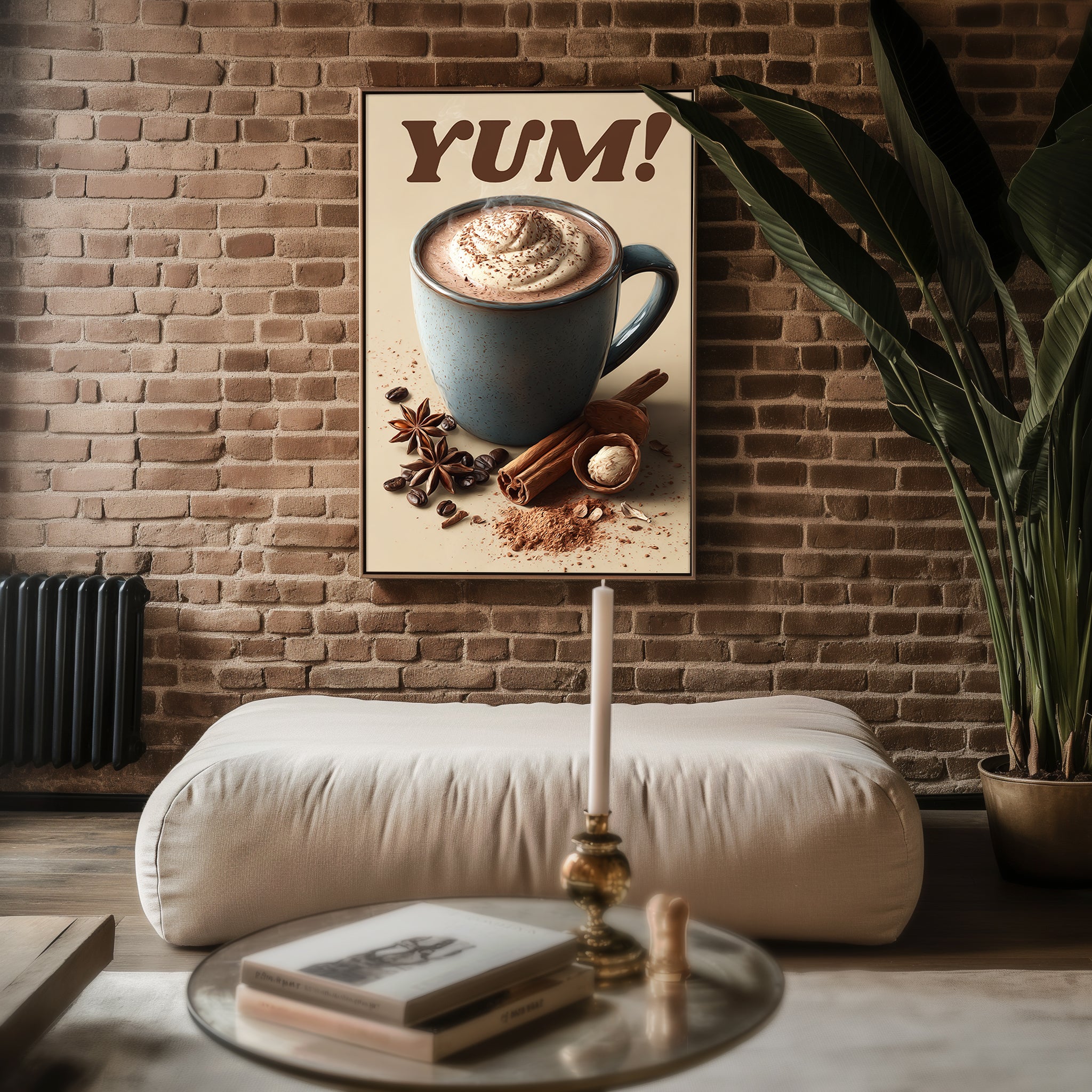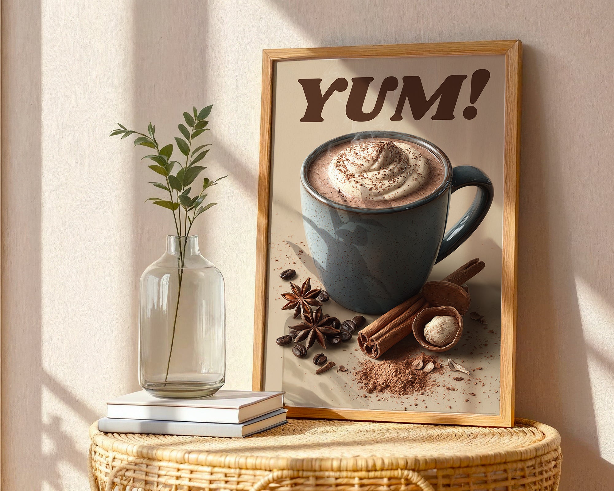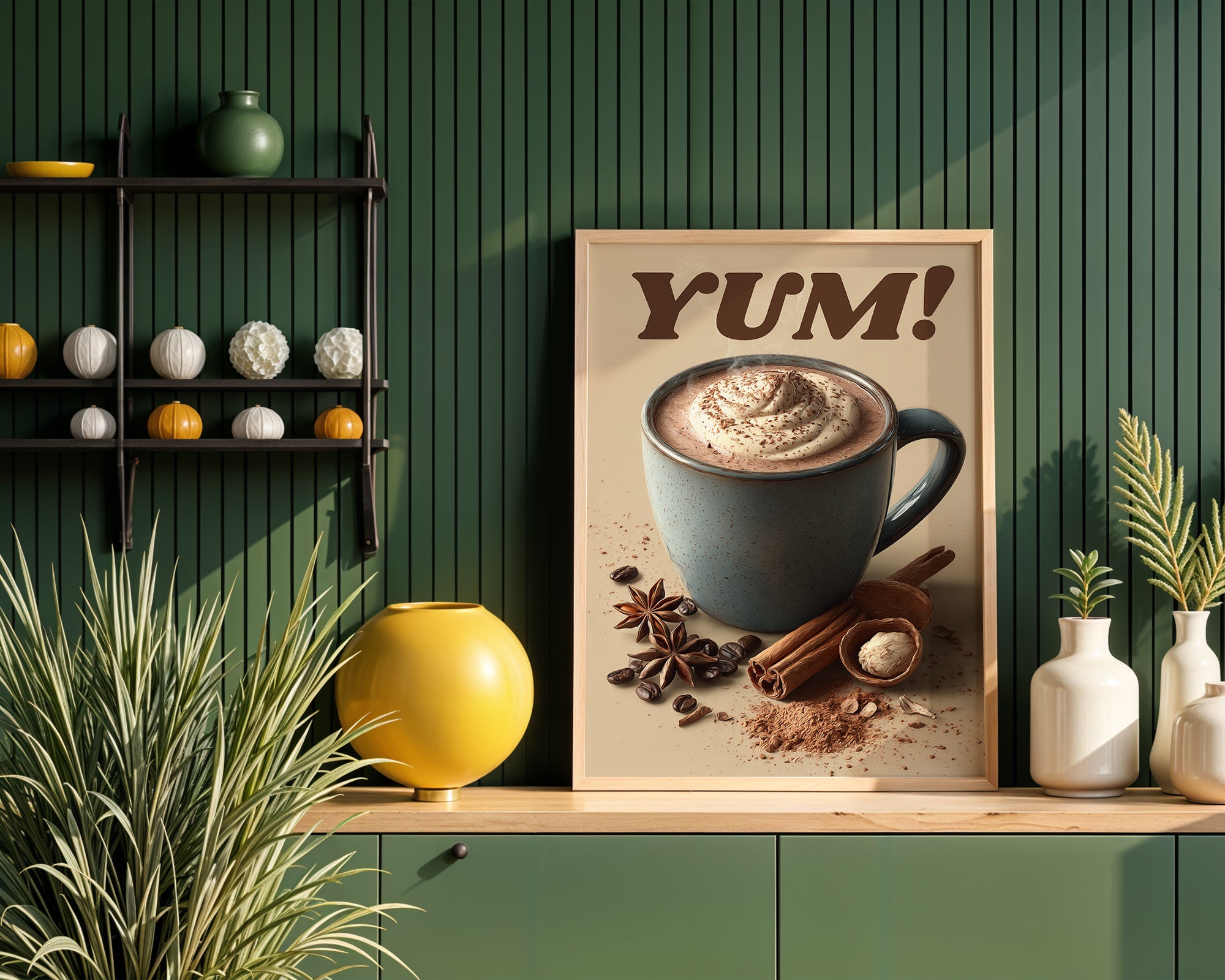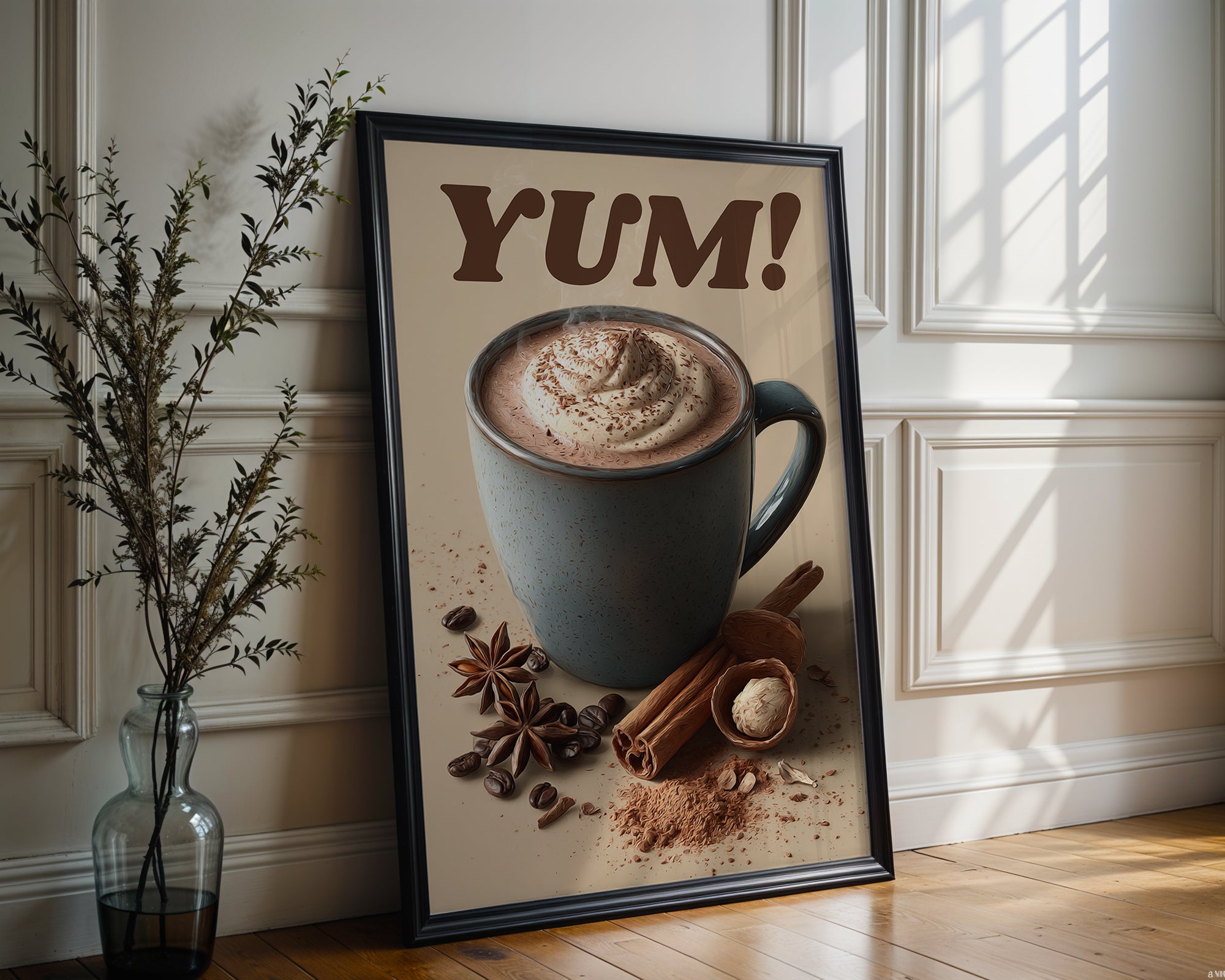 Some art just makes your mouth water. The YUM! Spiced Hot Chocolate Poster is all rich flavor, warm spice, and whipped cream perfection. A steaming blue mug, topped with swirls of cream and shavings of chocolate, surrounded by coffee beans, cinnamon sticks, and nutmeg — this print smells like comfort just looking at it.